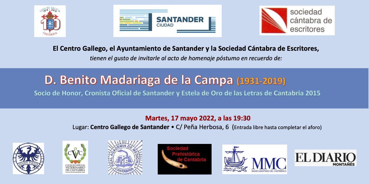 El martes 17 de mayo, a las 19,30 h, tendrá lugar en el Centro Gallego de Santander (C/ Peña Herbosa, 6) un acto de homenaje póstumo a Benito Madariaga de la Campa, organizado por la Casa de Galicia y la Sociedad Cántabra de Escritores.