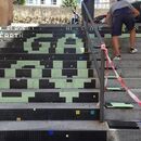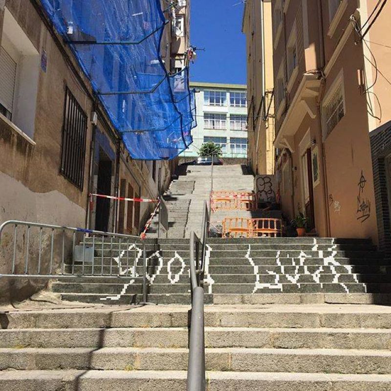 Las huellas de la undécima edición del Festival de Arte Público Desvelarte han llegado de nuevo a la escalera ubicada en las calles Los Aguayos y San Antón. Este espacio ya fue intervenido en la pasada edición por el artista 7Pies pero, en esta ocasión, Rubén Martínez, Sara Morante y Fernando Navarro han creado sus propios diseños para completar la acción en el lugar. Como en 2018, se colocarán azulejos vítreos con cemento para, una vez más, plantear un doble juego visual: por una parte, el de las contrahuellas que originan una única imagen y por otra, el de las distintas piezas de color que configuran el mosaico.