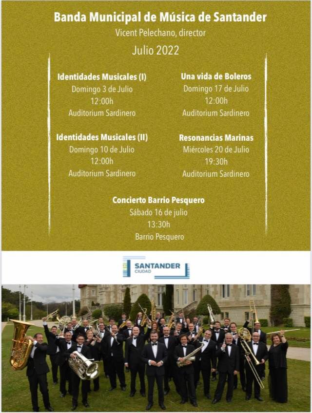 La Banda Municipal de Música de Santander, dirigida por Vicent Pelechano, ofrece dos conciertos en el Auditorium Los Carabelas, situado en El Sardinero, los domingos 3 y 10 de julio a las 12:00 h.