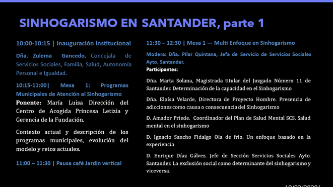 El objetivo es mostrar cómo cada disciplina contribuye a comprender y abordar el sinhogarismo desde una perspectiva integral, los retos, las dificultades y casos de éxito. La participación descrita es clave para comprender los elementos que funcionan dentro del sistema, los que presentan dificultades y los puntos críticos de mejora: su paso por los recursos municipales, las barreras encontradas y las oportunidades de autonomía. La mesa estará moderada por la jefa de Servicio de los Servicios Sociales del Ayuntamiento de Santander, Pilar Quintana.