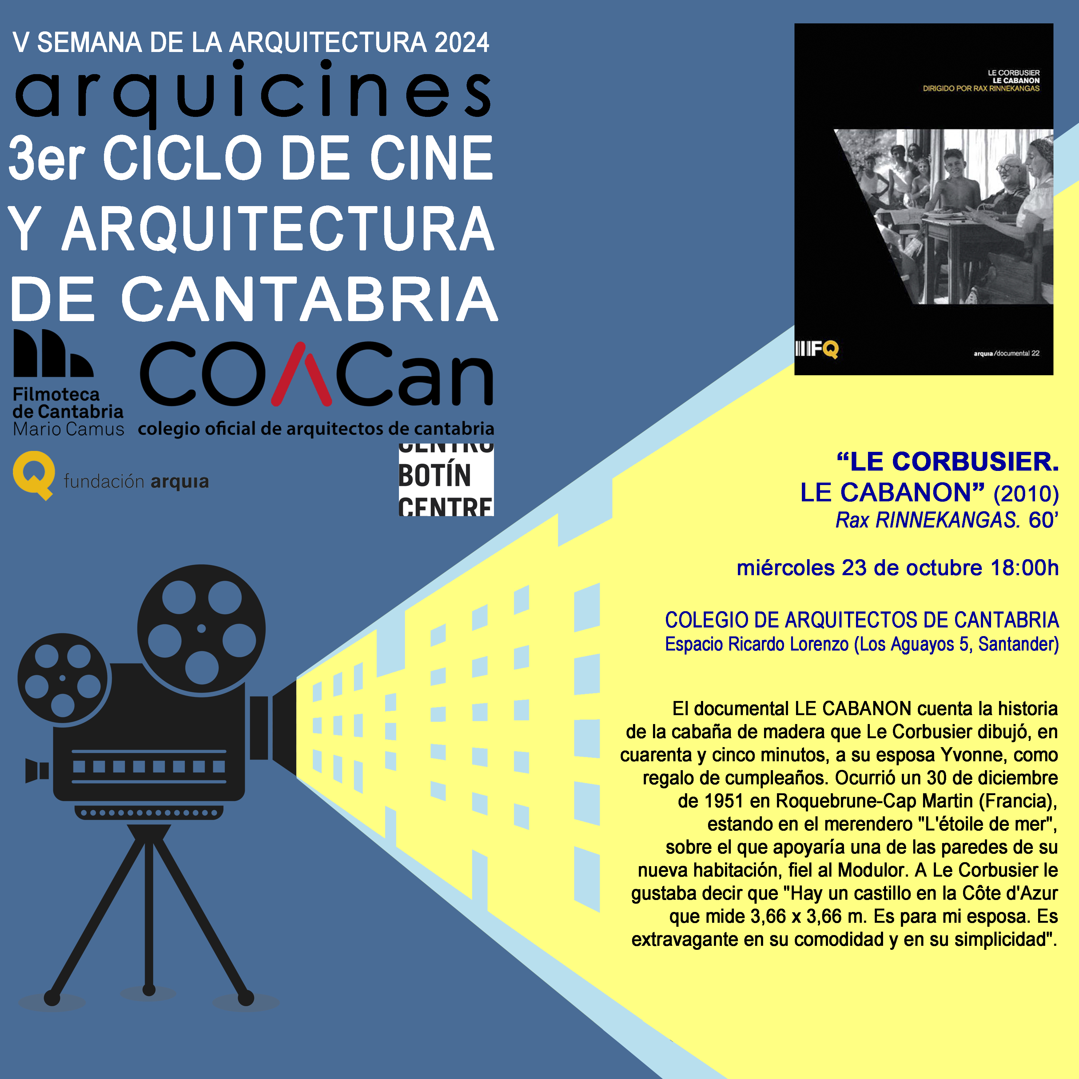 Tercera edición del Ciclo de Cine y Arquitectura de Cantabria, Arquicines, un ciclo de películas y documentales relacionados con el amplio universo de la Arquitectura. Esta iniciativa del COACan, en colaboración con la Filmoteca de Cantabria, el Centro Botín y la Fundación Arquia, nació en 2022 con vocación de continuidad. Esta tercera edición contará con 16 títulos: un cortometraje, cuatro películas películas, una miniserie y diez documentales.