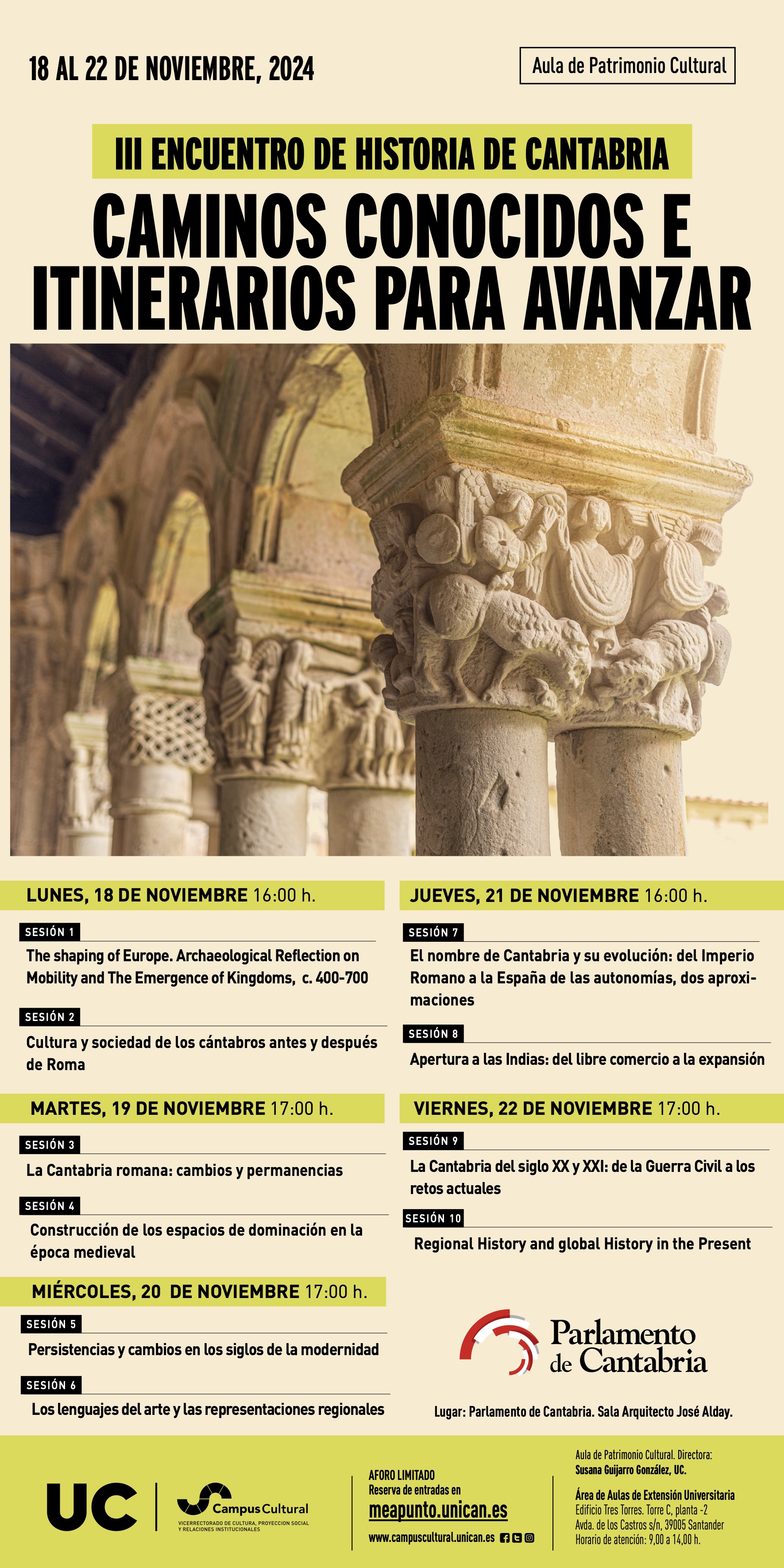 Coordinado por la directora del Aula de Patrimonio de la UC, la historiadora Susana Guijarro, con el apoyo de un amplio y solvente comité científico nutrido por especialistas de la UC, se celebrará entre el 18 y el 22 de noviembre próximos, el programa permite un amplio repaso diacrónico del cambio de las estructuras económicas y sociales, culturales, religiosas y políticas en la región, dispensando las novedades producidas durante los últimos años en el conocimiento de la historia de las generaciones que vivieron a lo largo del tiempo en nuestra región. La experiencia también permitirá evaluar la relevancia actual de la historia regional como enfoque historiográfico y metodológico que requiere un esfuerzo interdisciplinar.