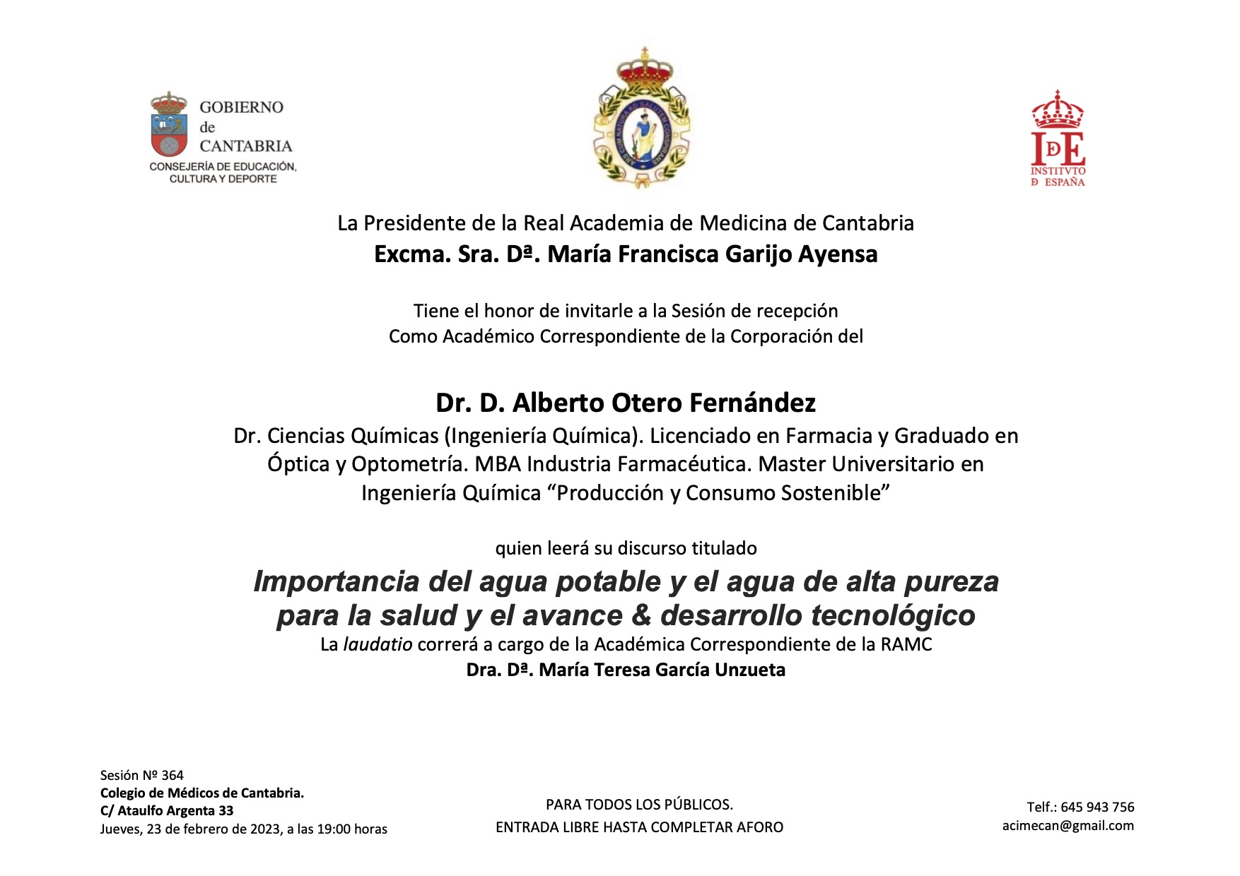 La Real Academia de Medicina de Cantabria recibe como académico correspondiente a Alberto Otero Fernández, quien leerá el discurso titulado “Importancia del agua potable y el agua de alta pureza para la salud y el avance & desarrollo tecnológico”. La laudatio correrá a cargo de la Académica Correspondiente de la RAMC María Teresa García Unzueta.