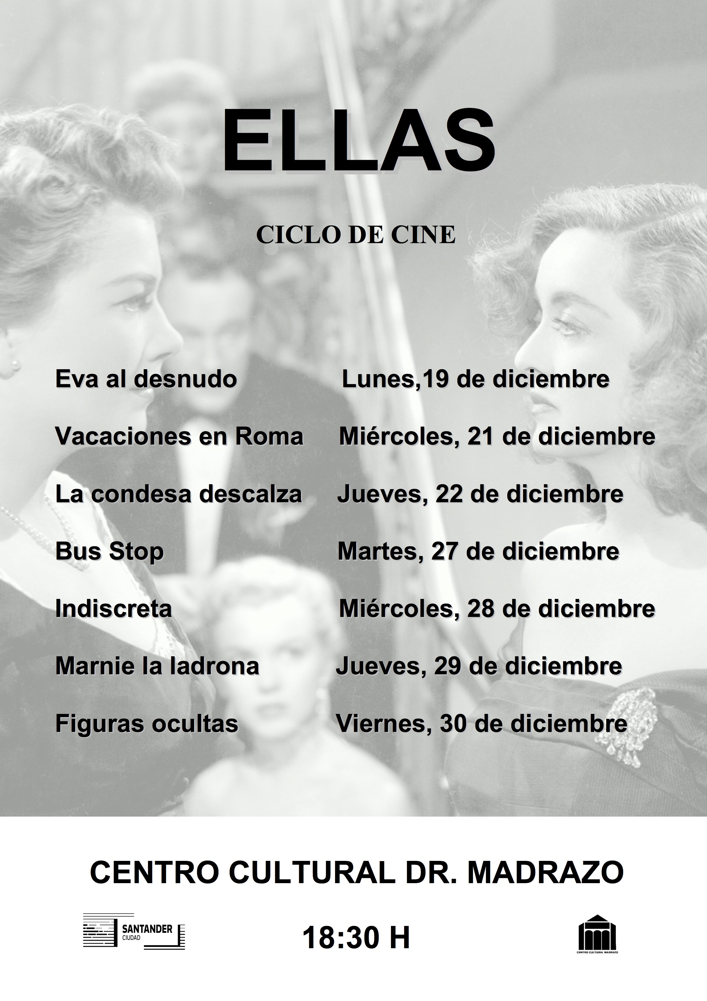 En la segunda quincena de diciembre, el Centro Cultural Dr. Madrazo llevará a cabo un ciclo de proyecciones titulado “Ellas”. Se trata de siete películas que cuentan historias centradas en mujeres, vistas desde distintas perspectivas y contextos, en las que se exploran sus personalidades y en algunos casos sus logros. Las películas, que se ofrecerán en versión española, comenzarán a las 18:30h.