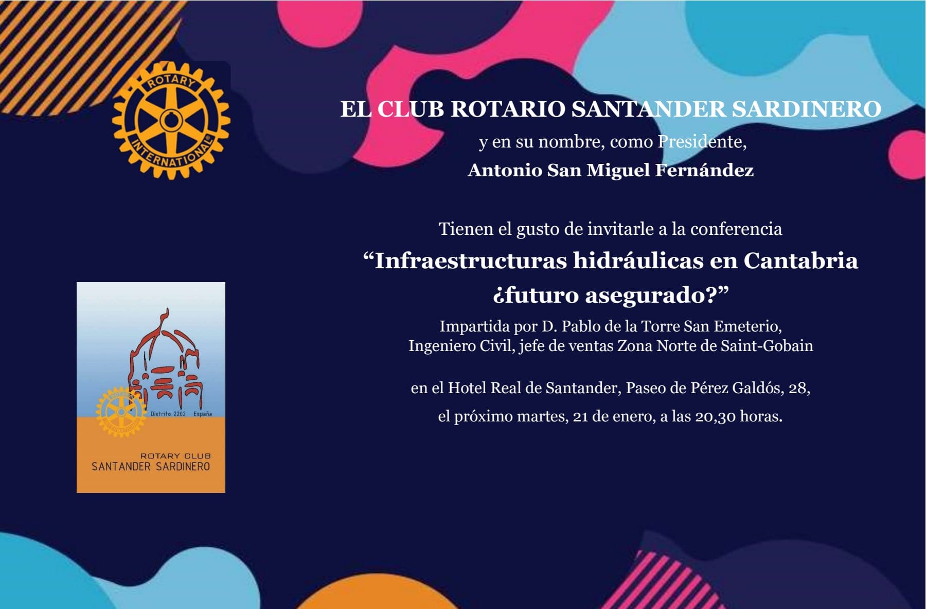 El Club Rotario Santander Sardinero organiza la conferencia "Infraestructuras hidráulicas en Cantabria ¿futuro asegurado?", que será impartida por Pablo de la Torre San Emeterio, ingeniero civil. jefe de ventas Zona Norte de Saint-Gobain.