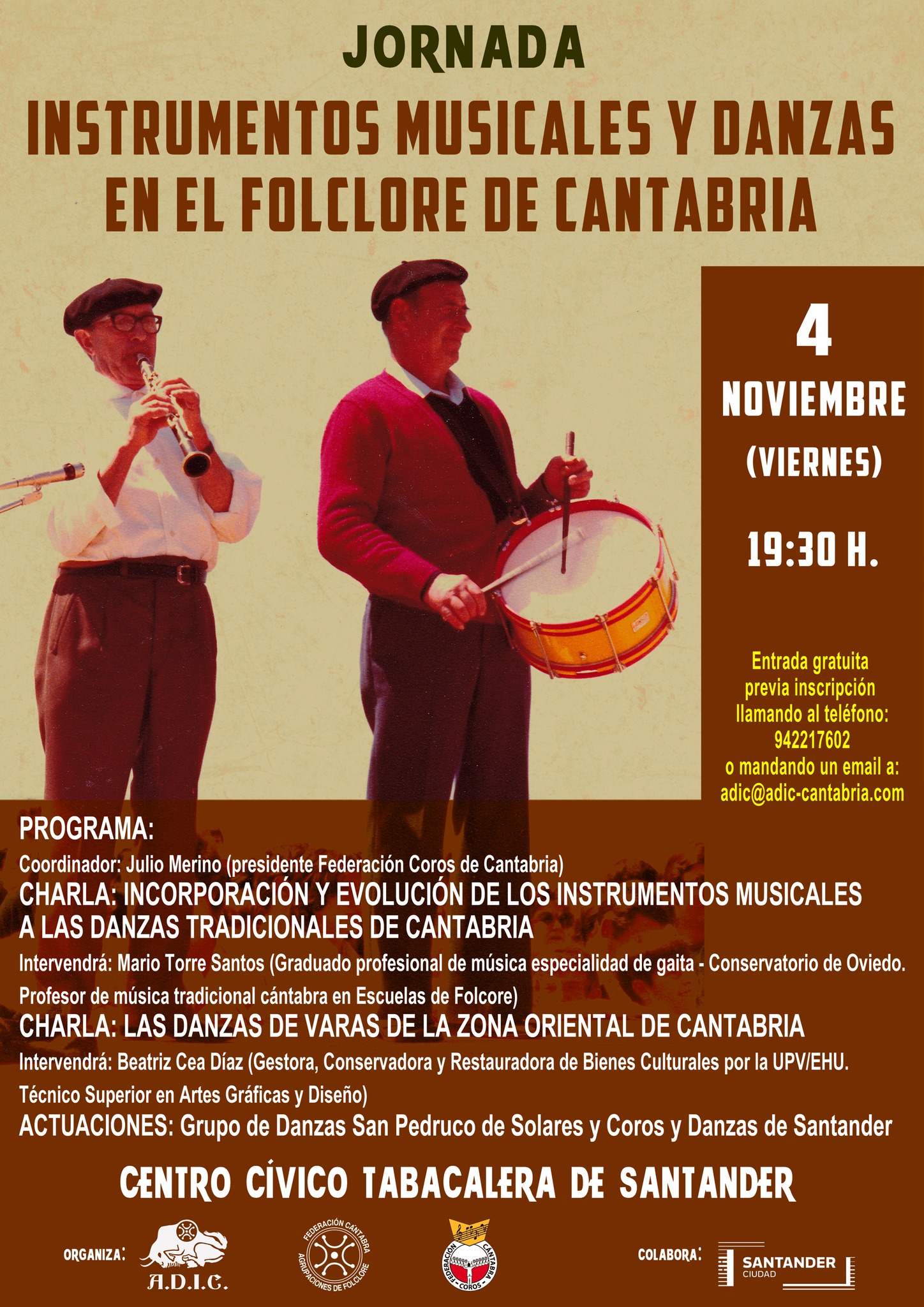 El Centro Cívico Tabacalera acoge la jornada "Instrumentos musicales y danzas en el folclore de Cantabria" el día 4 de noviembre. Un evento organizado por la Asociación para la Defensa de los Intereses de Cantabria (ADIC), la Federación de Coros de Cantabria y la Federación de Agrupaciones de Folclore de Cantabria, junto al Ayuntamiento de Santander, que empezará a partir de las 19:30 horas. La entrada será gratuita, previa inscripción llamando al teléfono 942217602 o enviando un email a: adic@adic-cantabria.com .