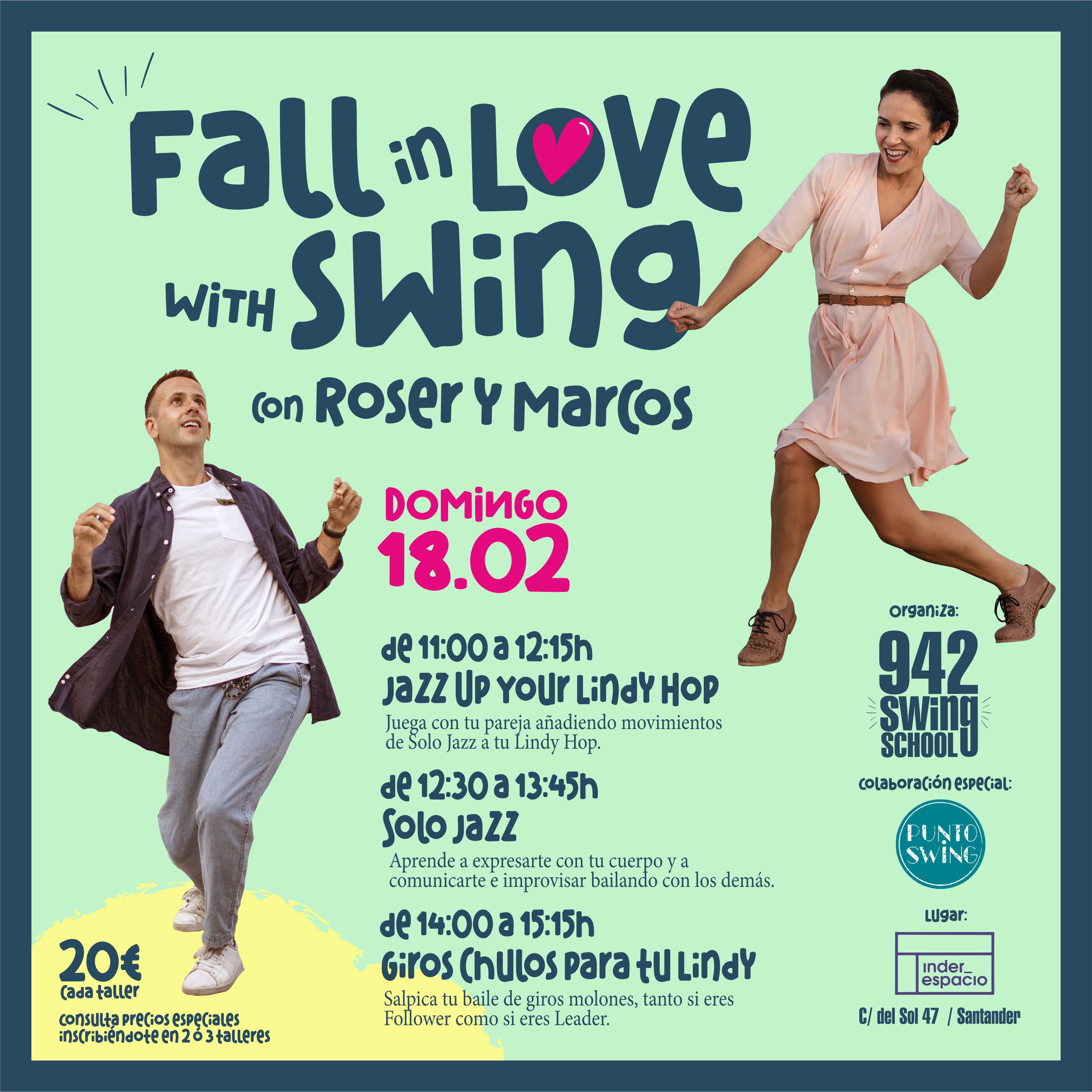 De 14.00 a 15.15 : "Giros chulos para tu lindy hop". Salpica tu baile de giros molones, tanto si eres Follower como si eres Leader. Bailas lindy hop con regularidad y dominas los pasos básicos, incluido el swing out.