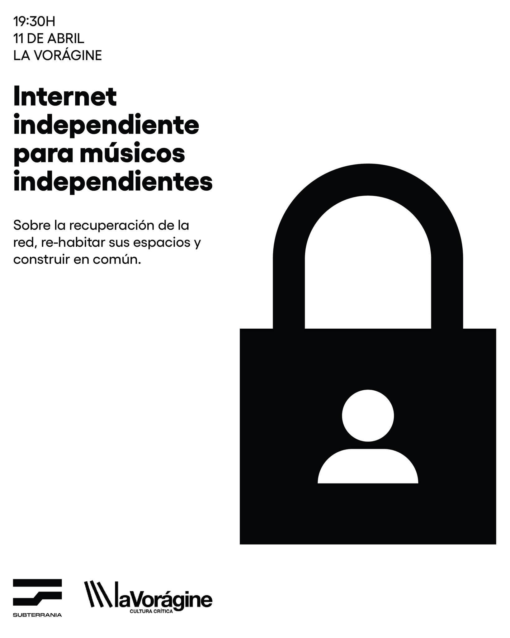 En esta charla se analizará el estado actual de la red, sus causas y la posición que ocupa la cultura independiente en la misma desde el punto de vista del sector musical. Detallarán las diferentes alternativas que internet nos sigue ofreciendo y debatirán sobre las posibilidades de construcción de espacios colectivos de difusión online en los que poder desarrollar la comunicación bajo nuestras propias normas.