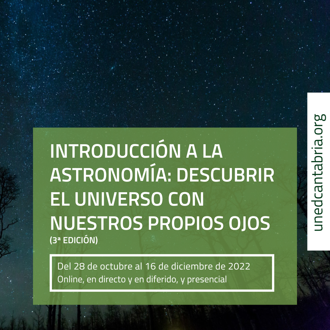 Neila Campos ofrecerá la tercera edición del curso "Introducción a la Astronomía: descubrir el universo con nuestros propios ojos" en UNED Cantabria, los viernes del 28 de octubre al 16 de diciembre de 2022, de 18:00 a 20:00 h., presencial y online, en directo y en diferido.