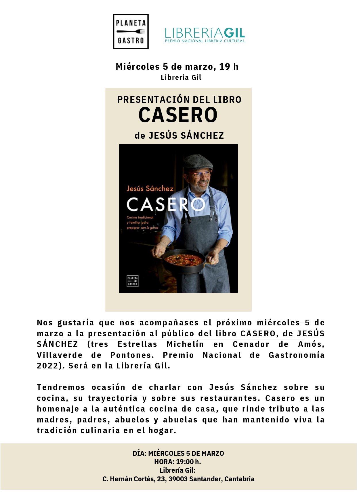 El miércoles 5 de marzo, a las 19:00 h. la Librería Gil acoge la presentación de “Casero”, de Jesús Sánchez. (Planeta Gastro).