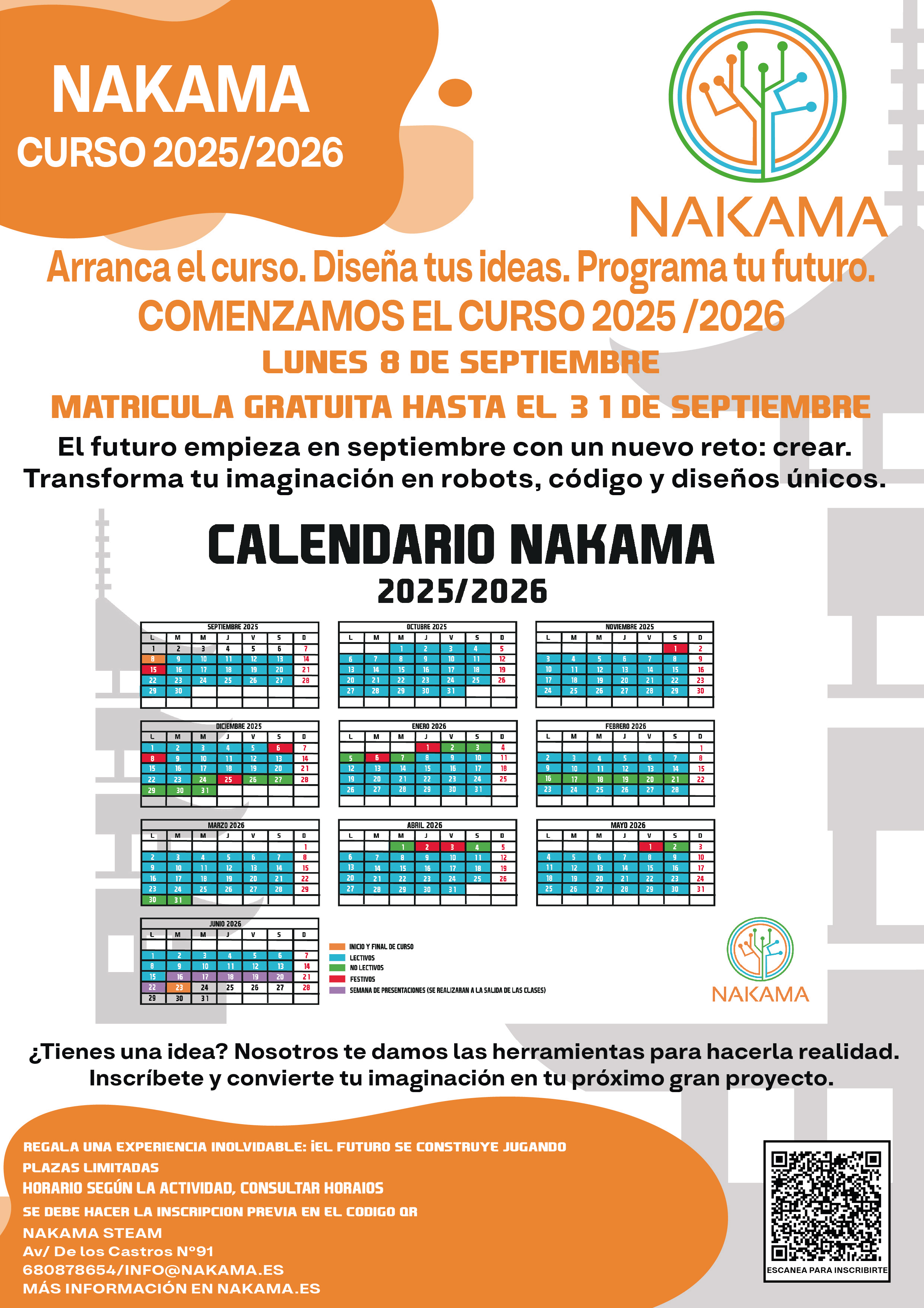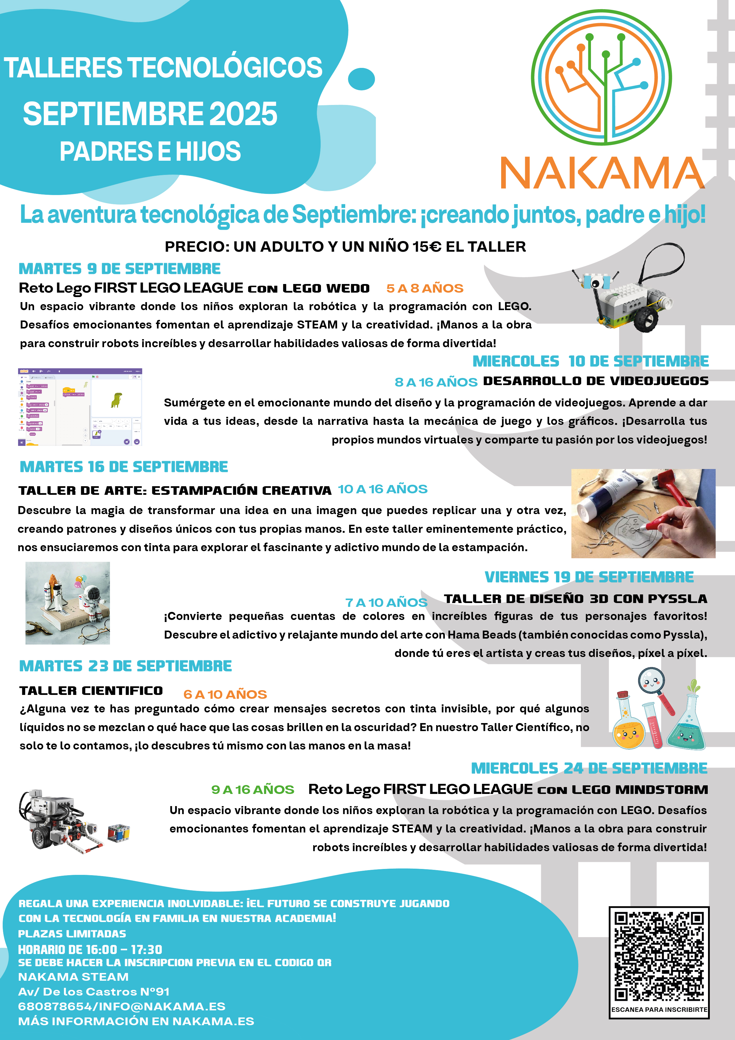 Jornada de puertas abiertas en Nakama Steam College, con talleres para niños o para padres e hijos. Ve a descubrir sus talleres gratuitos, donde la diversión y el aprendizaje están a la orden del día. Desde programar videojuegos hasta manejar robots LEGO, ¡hay una aventura esperándote! Pero no olvides que es necesario inscribirse con anticipación. Llama al 680 878654 o envía un correo a info@nakam.es y asegura tu lugar en esta increíble experiencia.