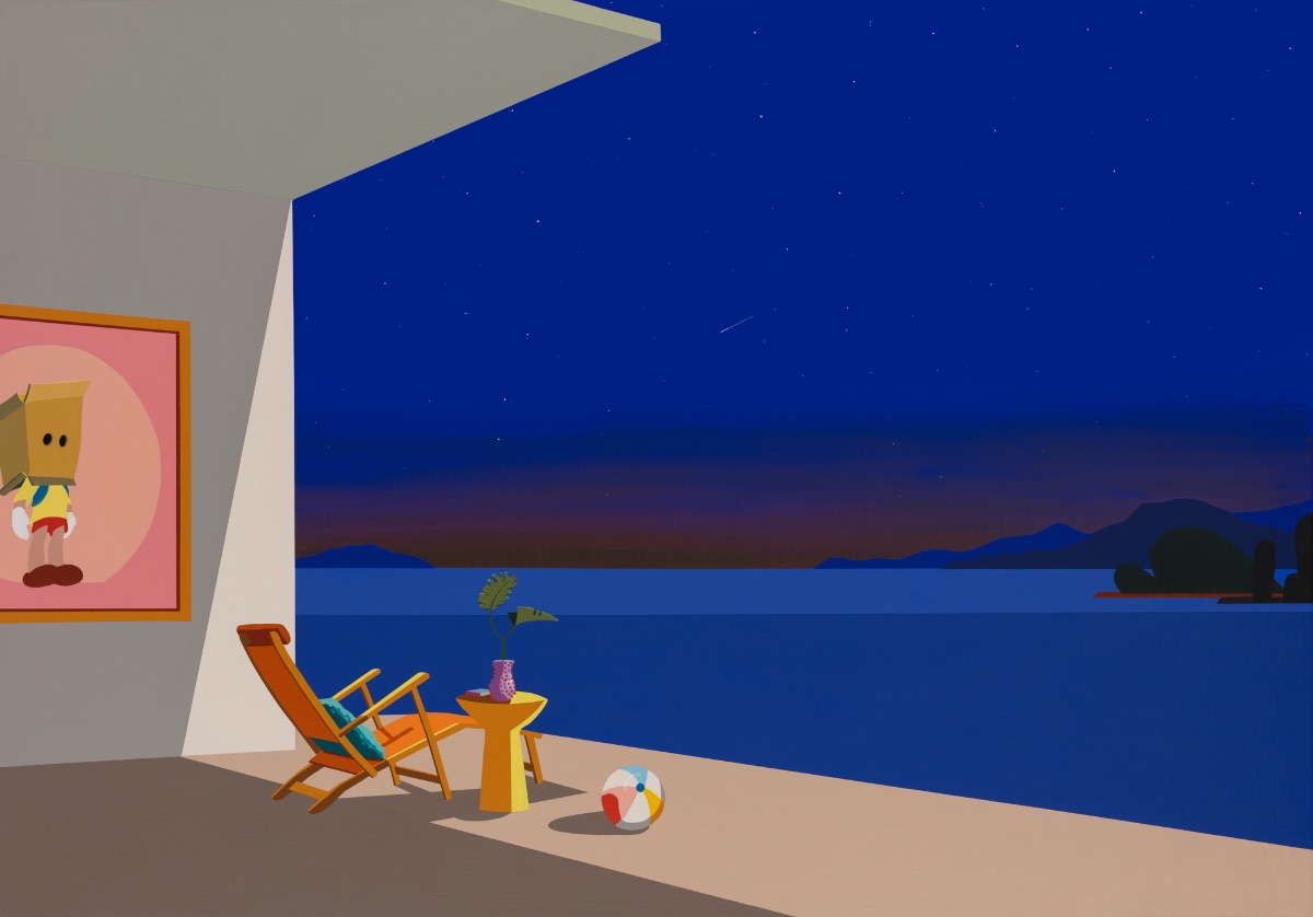 En este universo, que oscila entre lo real y lo surreal, la arquitectura aparece como si estuviera sobre un escenario, resaltada por un juego de luces casi teatral que Night light IV, 2025. Acrílico sobre tela. 60 x 81 cm. contrasta con el inmenso océano que domina las composiciones. Las formas geométricas de influencia del movimiento moderno dialogan con la vastedad natural, creando una delicada tensión que resalta la belleza efímera de ese momento.