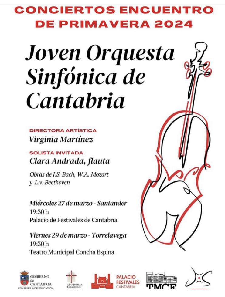 Concierto de la JOSCAN dentro del Encuentro de Primavera 2024. Solista invitada Clara Andrada, flauta principal de la Frankfurt Radio Symphony Orchestra y de la Chamber Orchestra of Europe, acompañada de profesorado especialista como Miguel Borrego (concertino de la Orquesta Sinfónica de RTVE), Claudia Do Minh (viola), Lorenzo Meseguer (violonchelo), Antonio Lapaz (clarinete), Dolores Chiralt (oboe), Miguel Angel Martínez (trompa) y Rafael Mas ( timbal).