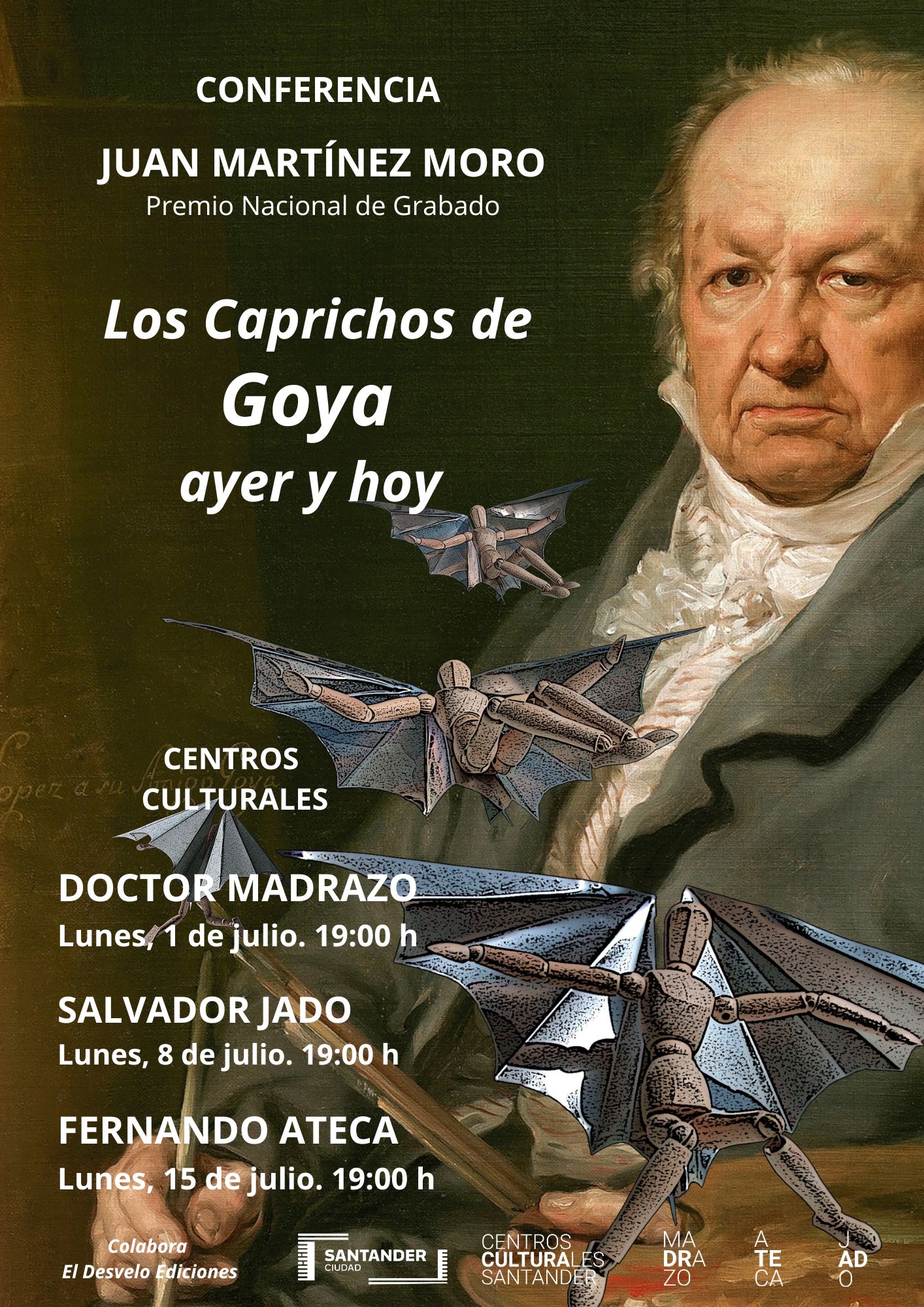 Juan Martínez Moro impartirá la conferencia "Los Caprichos de Goya, ayer y hoy" en los centros culturales Dr. Madrazo, Salvador Jado y Fernando Ateca, en sendas sesiones que tendrán lugar los lunes 1, 8 y 15 de julio, a las 19:00 h.
