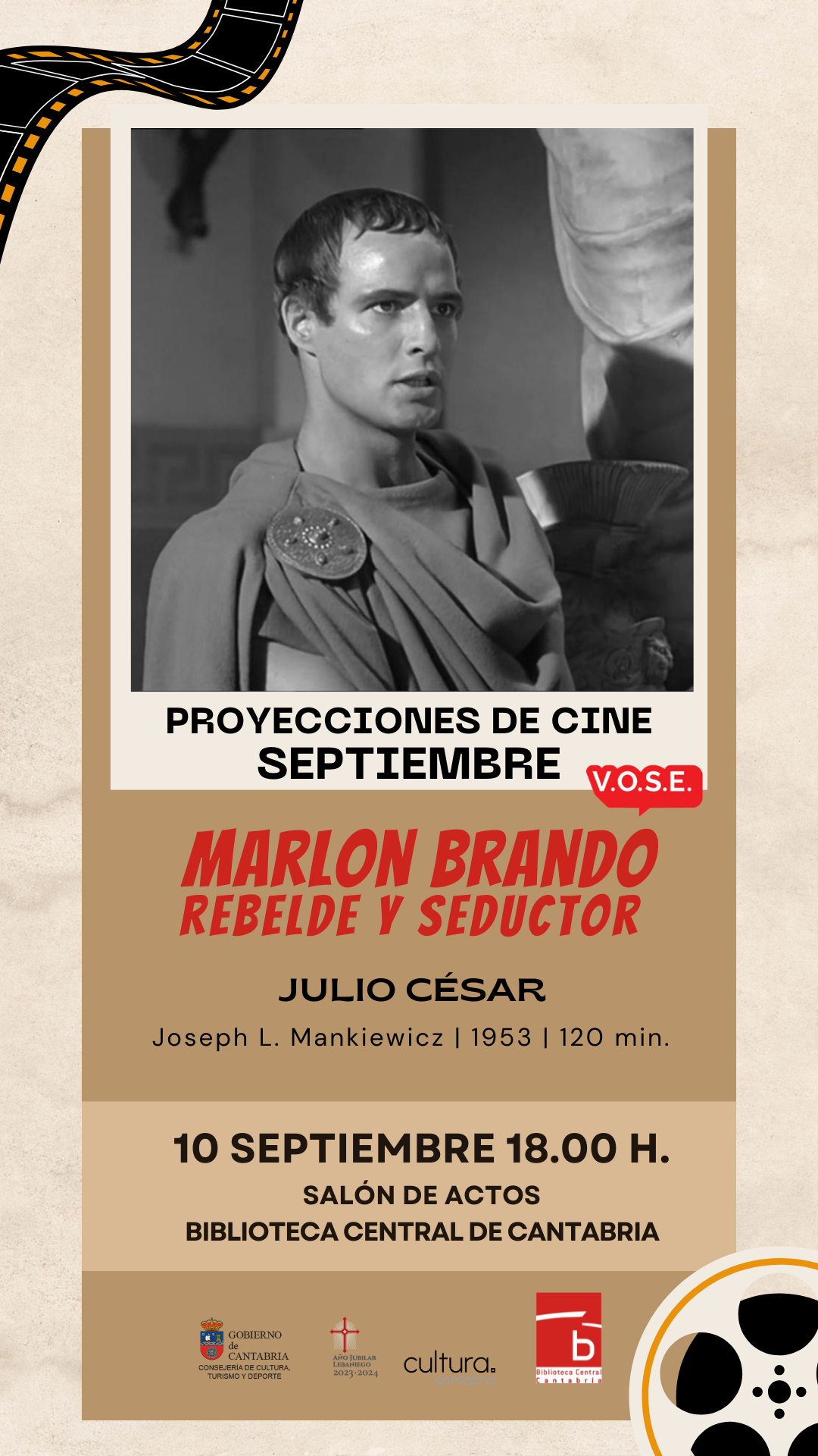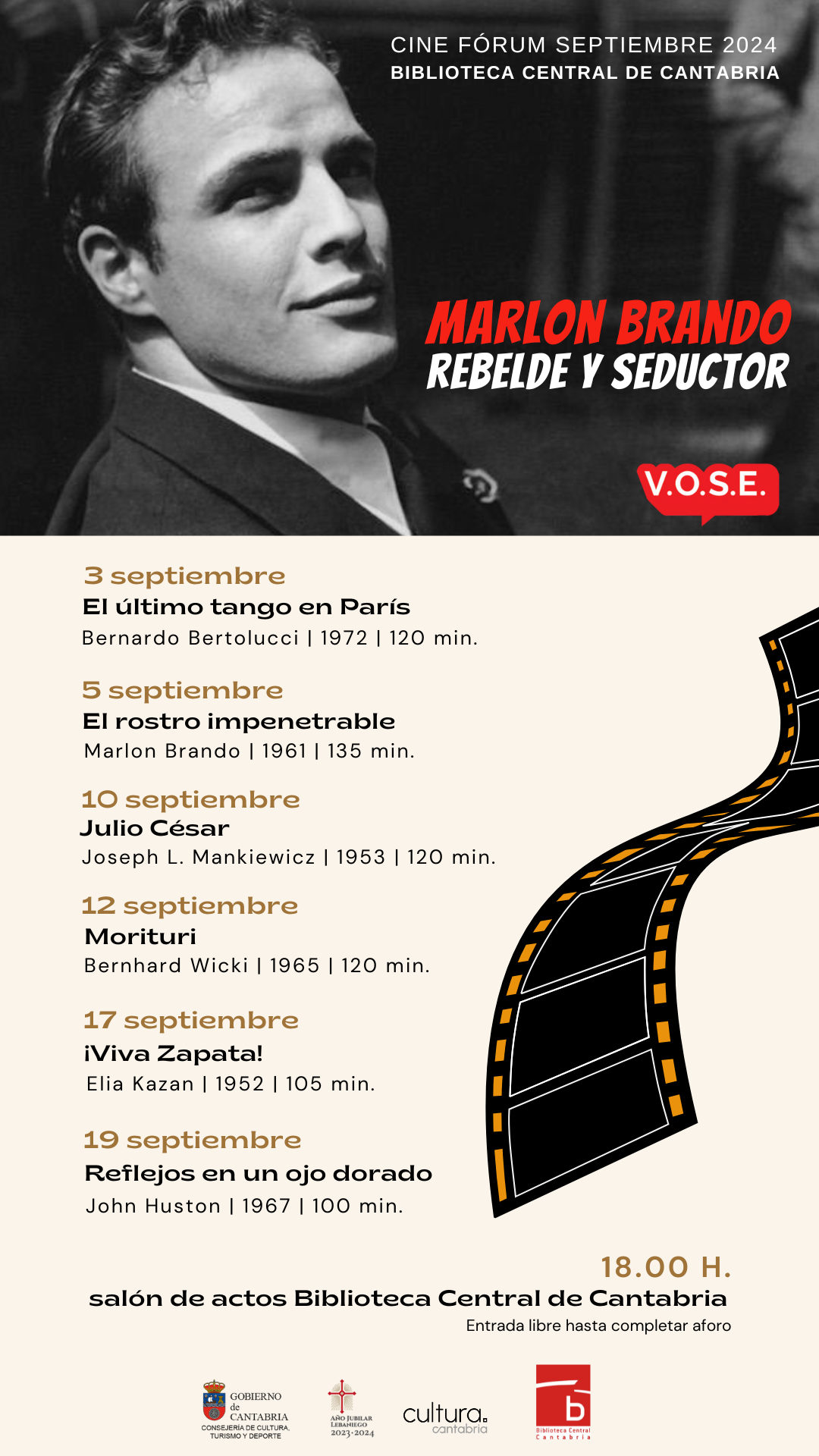 La Biblioteca Central de Cantabria dedica el mes de septiembre a Marlon Brando, intérprete único e inabarcable, protagonista de una carrera de leyenda, eterno, rebelde y seductor, a través de cinco proyecciones que abarcan cronológicamente la etapa de su filmografía comprendida entre los 50 y los inicios de los 70, incluyendo diferentes géneros (bélico, romance, western, espionaje, biopic e histórico), películas dirigidas por algunos de los mejores realizadores de la historia del cine, entre ellas la única que Brando dirigió, el western El rostro impenetrable.