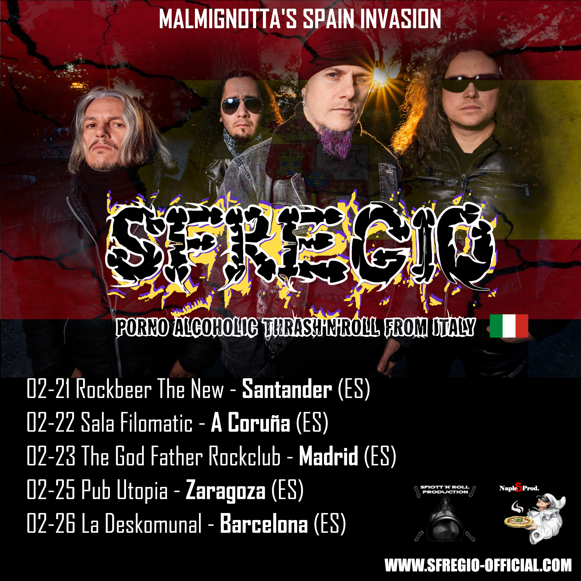 La banda italiana Sfregio, con su quinto álbum Malmignotta, está lista para llevar su irreverente y políticamente incorrecto Porno Alcoholic Thrash 'n' Roll a España. Una explosiva mezcla de heavy metal, punk y thrash metal que arrasará cinco ciudades españolas con cinco noches imperdibles para los amantes del metal.