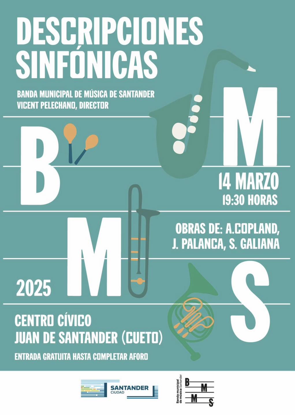 Bajo el título de “Descripciones sinfónicas”, la Banda Municipal de Música de Santander ofrece un concierto el viernes 14 de marzo a las 19:30h en el Centro Cívico Juan de Santander (Cueto).
