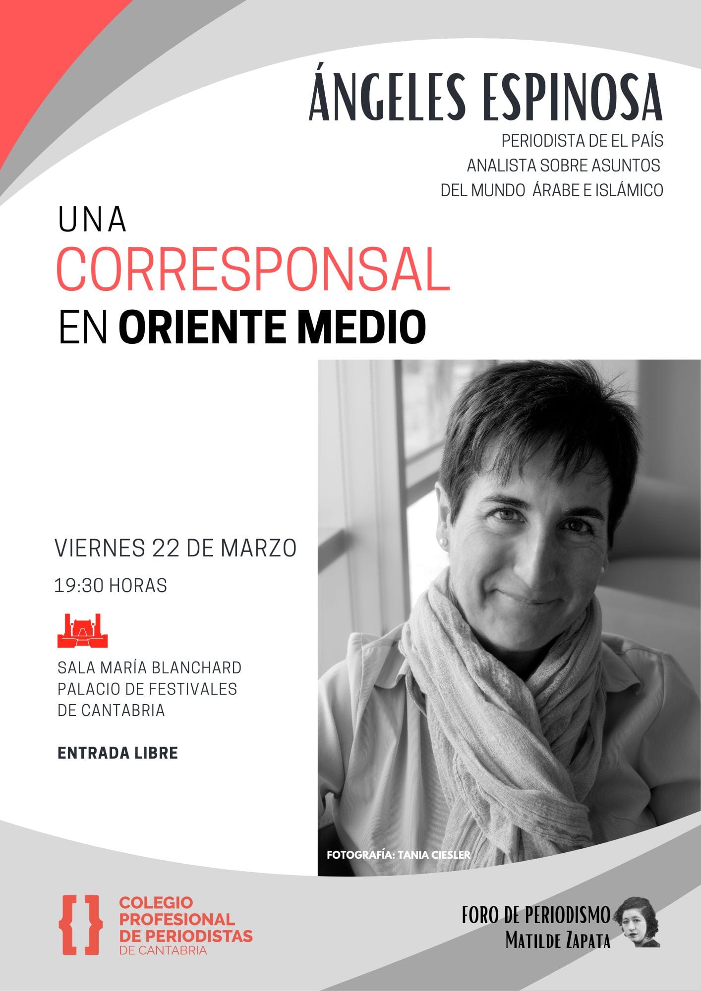 El primer encuentro lo protagoniza este viernes 22 de marzo la corresponsal de El País Ángeles Espinosa, experta analista sobre asuntos del mundo árabe e islámico. La charla -conducida por la decana del Colegio, Olga Agüero- será a las 19:30 horas en la Sala María Blanchard del Palacio de Festivales con entrada libre para todos los ciudadanos interesados.