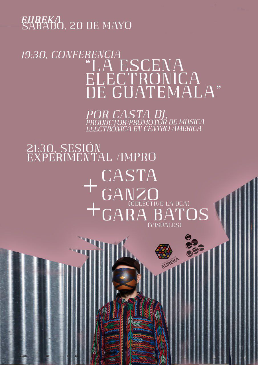 Este próximo sábado 20 de mayo, después de pasar la noche anterior por “La Parroquia” (Torrelavega), estará en Eureka, donde ofrecerá una conferencia a las 19.30h sobre la escena electrónica de Guatemala y posteriormente realizará una sesión experimental e improvisada junto a Ganzo (Colectivo La UCA) y la artista visual Tamara García AKA Gara Batos