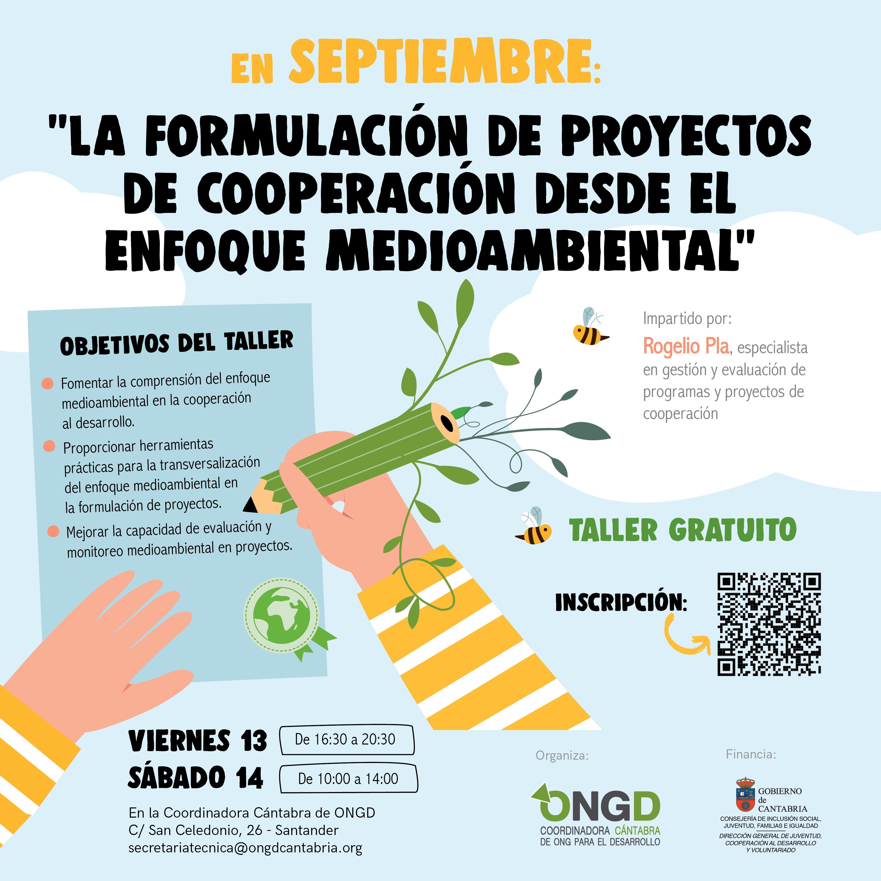 La Coordinadora Cántabra de ONGD, con el apoyo de la Dirección General de Juventud, Cooperación al Desarrollo y Voluntariado del Gobierno de Cantabria, organiza este curso de 8 h de duración sobre “La formulación de proyectos de cooperación desde el enfoque medioambiental”.