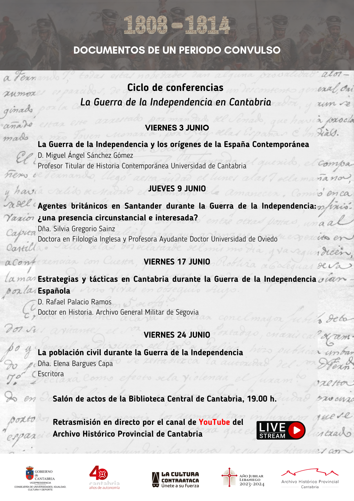El Archivo Histórico Provincial programa un ciclo de conferencias sobre la Guerra de la Independencia en Cantabria en diferentes formatos con motivo de la exposición “1808-1814. Documentos de un periodo convulso” que puede visitarse en la sala Piti Cantalapiedra durante los meses de mayo a julio.