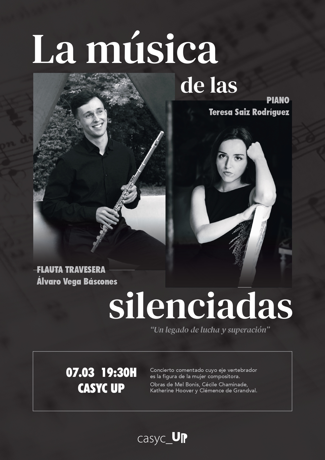 Los jóvenes intérpretes santanderinos Teresa Saiz (piano) y Álvaro Vega Báscones (flauta travesera), presentan un programa de concierto cuyo eje vertebrador es la figura de la mujer compositora. Con ello, buscan rescatar y poner en valor las obras de quienes lucharon por ser reconocidas en una profesión históricamente dominada por figuras masculinas.