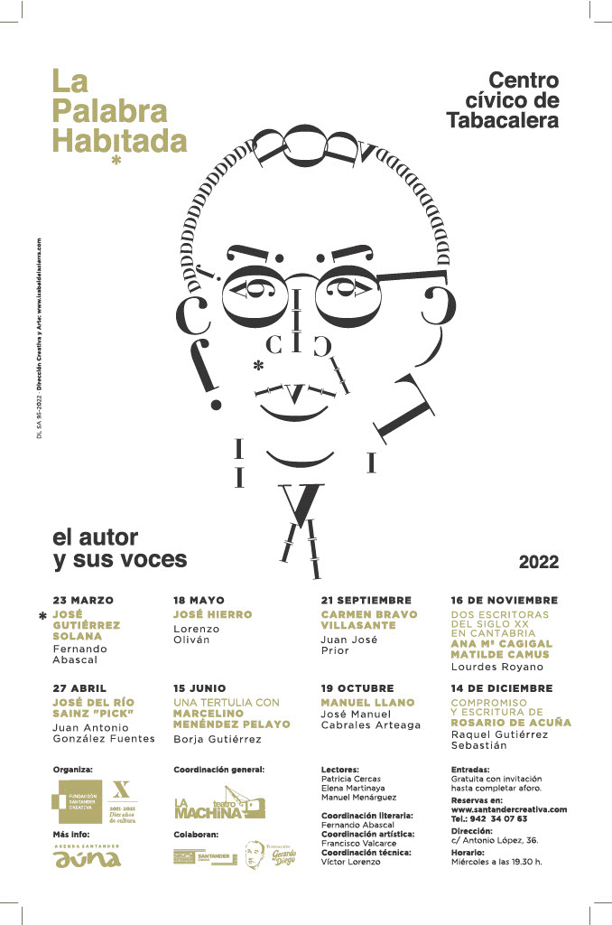 Expertos y actores profesionales revivirán las obras de una decena de autores vinculados a Cantabria durante la tercera edición del ciclo “La Palabra Habitada”, uno de los proyectos que forman parte de la programación propia de la Fundación Santander Creativa (FSC) y que este año traslada su programación al Centro Cívico de Tabacalera del 23 de marzo al 14 de diciembre. El ciclo está coordinado por La Machina Teatro y cuenta con la colaboración de la Fundación Gerardo Diego. La imagen gráfica de este proyecto es obra de la diseñadora cántabra Isabel de la Sierra.