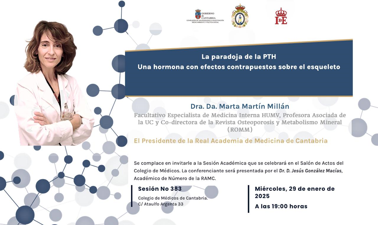 La Real Academia de Medicina de Cantabria celebra sesión académica en la que la doctora Marta Martín Millán pronunciará la conferencia "La paradoja de la PTH. Una hormona con efectos contrapuestos sobre el esqueleto".