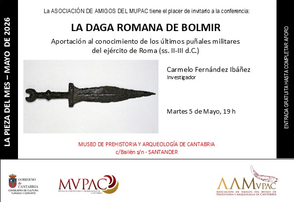 En esta ocasión, la conferencia girará en torno a “La daga romana de Bolmir. Aportación al conocimiento de los últimos puñales militares del ejército de Roma (ss. II-III d.C.)" y será impartida por Carmelo Fernández Ibáñez.