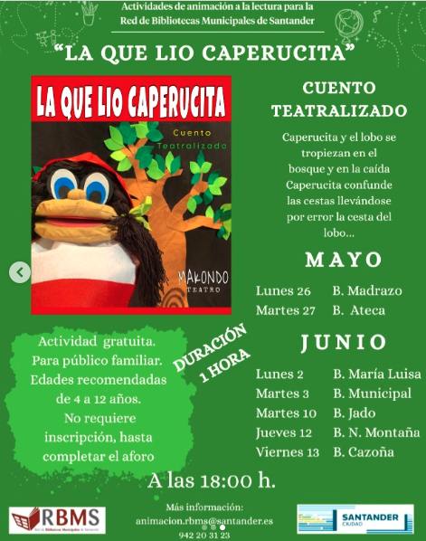 “La que lió Caperucita” es un cuento teatralizado, dirigido a público familiar. Edades recomendadas: de 4 a 12 años. No requiere inscripción, entrada libre hasta completar el aforo.