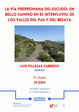 El escritor Luis Villegas Cabredo imparte en el Centro Gallego de Santander la conferencia "La vía prerromana del Escudo: un bello camino en el interfluvio de los valles del Pas y del Besaya". La cita será el martes 21 de mayo a las 19:30 horas, con entrada libre hasta completar el aforo.