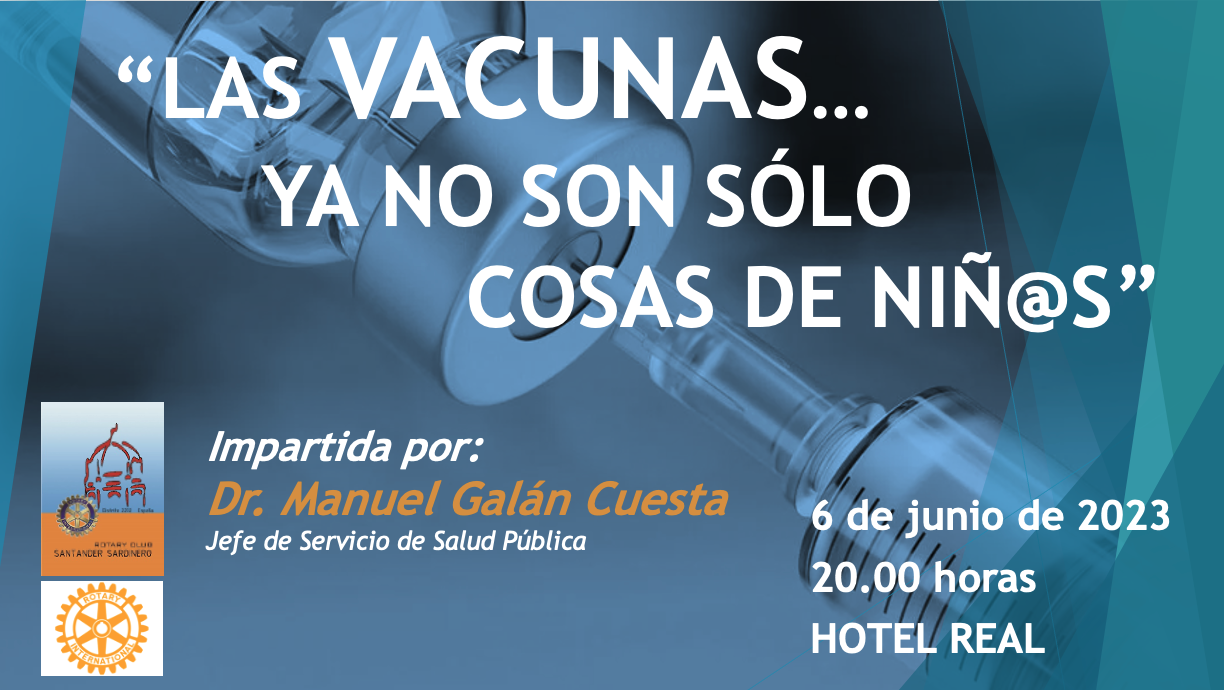El Club Rotario Santander-Sardinero organiza la conferencia “Las vacunas ya no son sólo cosa de niños”, que será impartida por Manuel Galán Cuesta, Jefe del Servicio de Salud Pública de la Consejería de Sanidad, en el Hotel Real, el 6 de junio 2023 a las 20:00 horas.
