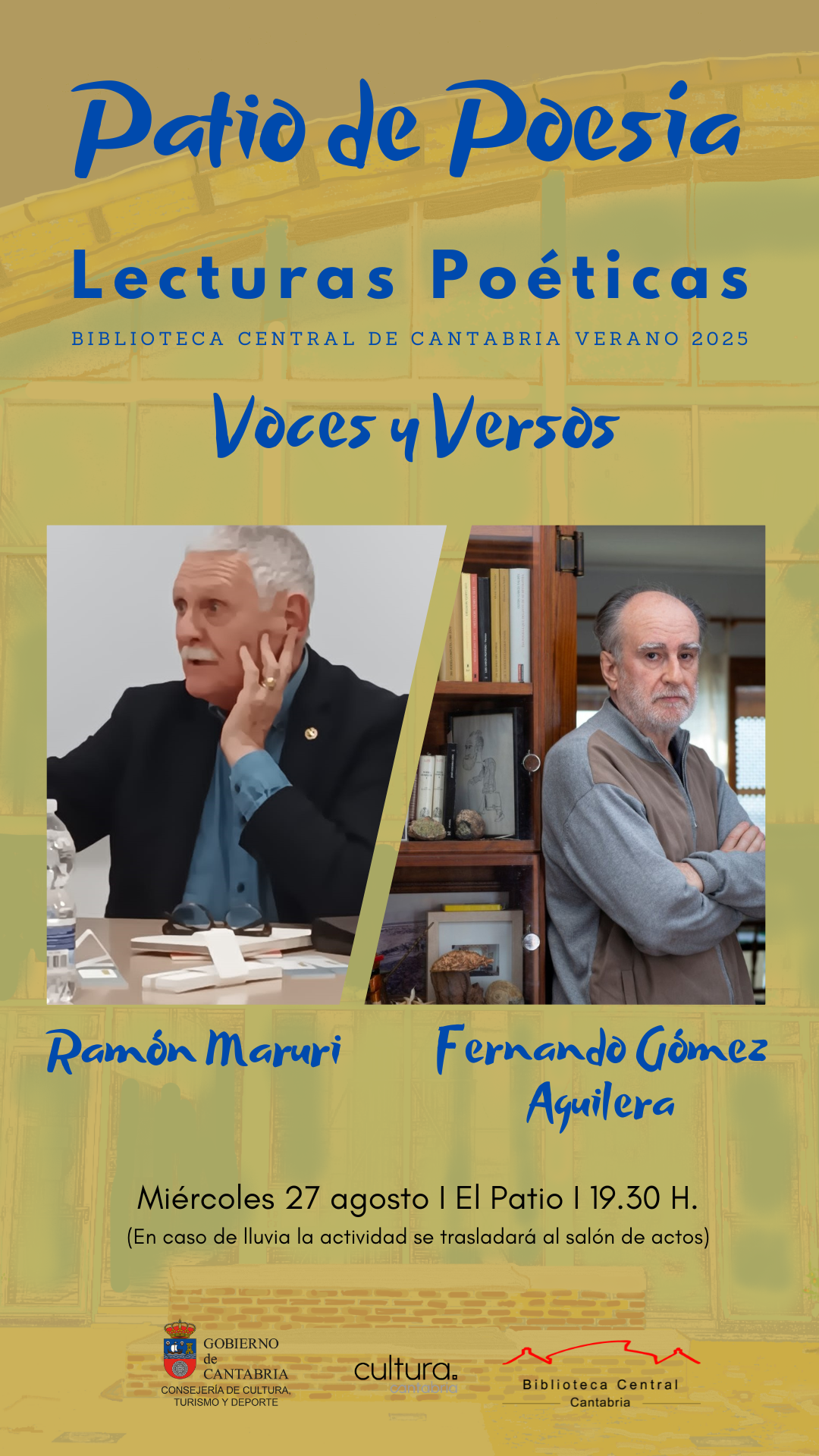 El miércoles 27 de agosto los autores invitados a realizar una lectura poética serán Fernando Gómez Aguilera y Ramón Maruri.