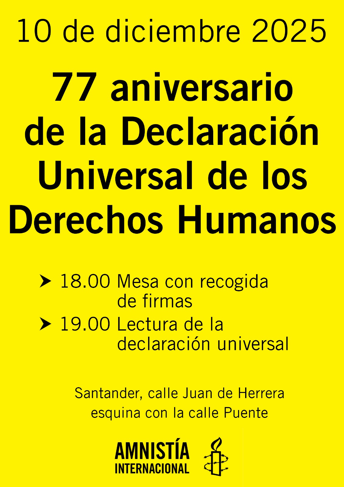 Amnistía Internacional, grupo de Santander, invita a la ciudadanía de Cantabria a participar en esta lectura pública de la Declaración Universal de los Derechos Humanos.