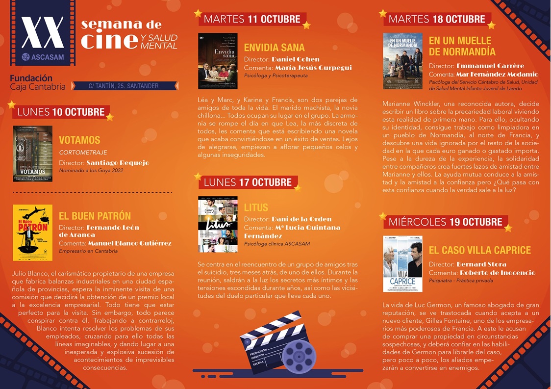 ASCASAM Cantabria celebra la XX edición de la Semana de Cine y Salud Mental. Este año consideran de especial importancia hablar sobre salud mental y, para ello, se servirán del soporte audiovisual de cinco películas y el cortometraje candidato a los Goya 2022 "Votamos".