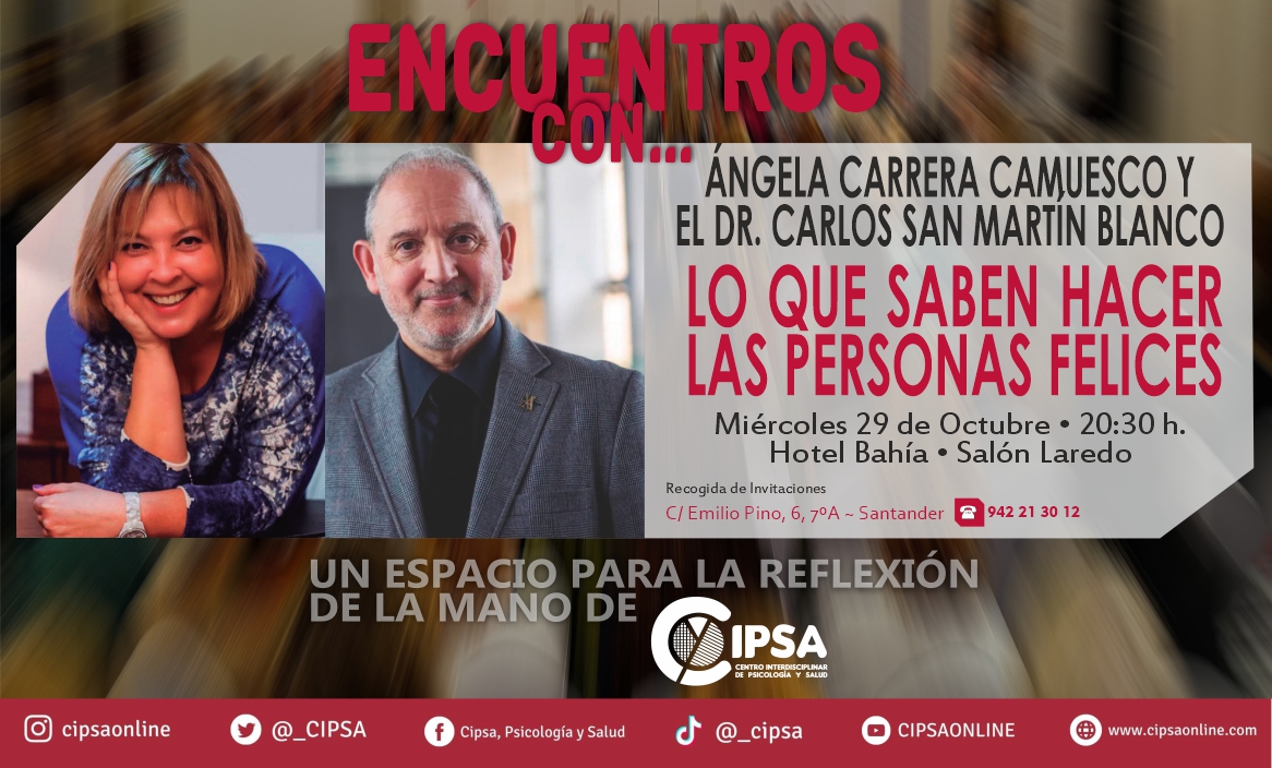 “Lo que saben hacer las personas felices” es el título del encuentro del mes de octubre que organiza el Centro Interdisciplinar de Psicología y Salud, CIPSA y que servirá de inicio de la 12ª temporada de esta actividad de divulgación científica. El encuentro será protagonizado en esta ocasión por los responsables de CIPSA, Ángela Carrera Camuesco y Carlos San Martín Blanco. Ambos profesionales entablarán un diálogo en el que nos ayudarán a conocer y reflexionar en relación con las principales claves de la felicidad y el bienestar.