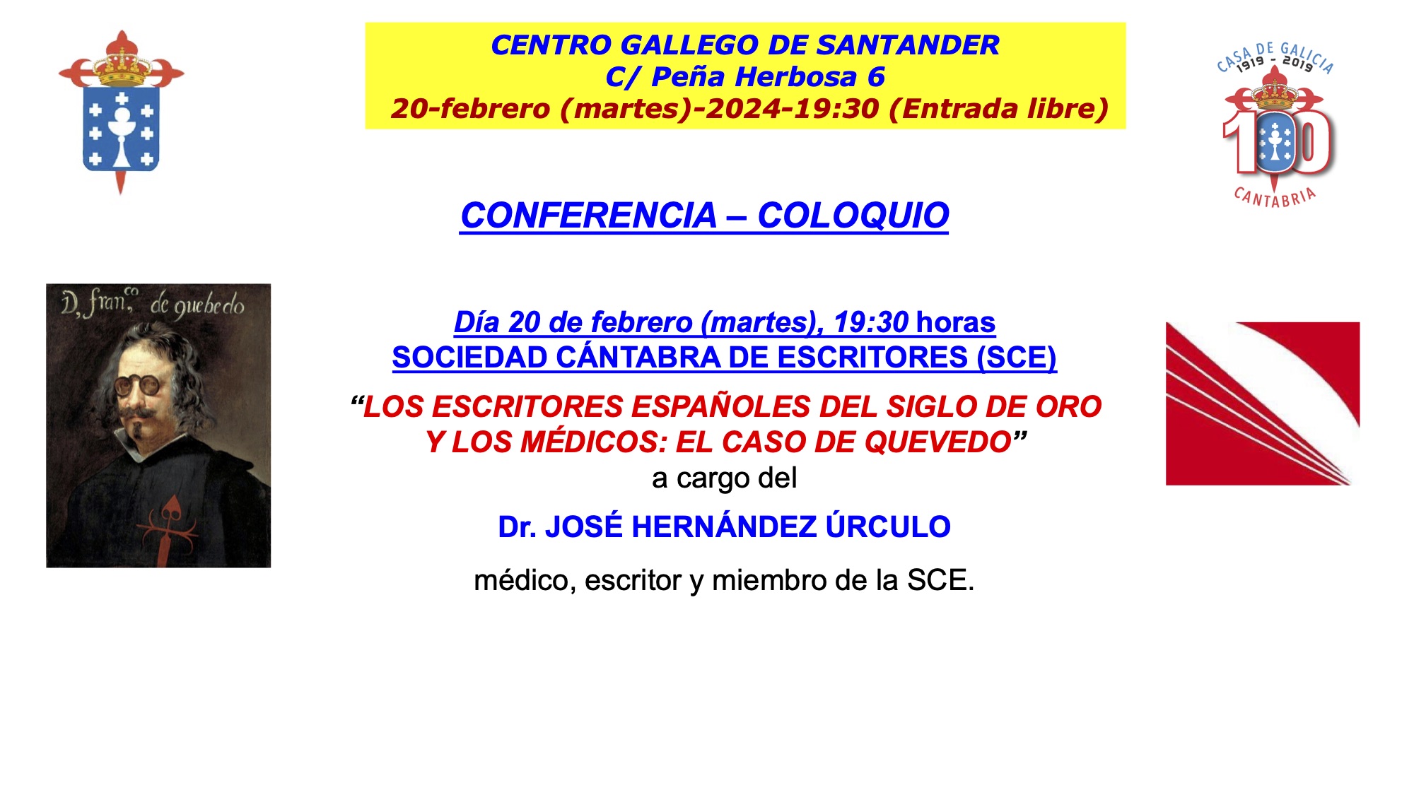 El Centro Gallego de Santander acoge la conferencia "Los escritores españoles del Siglo de Oro y los médicos: el caso de Quevedo", que será impartida por José Hernández Úrculo, médico, escritor y miembro de la Sociedad Cántabra de Escritores, entidad organizadora del evento.