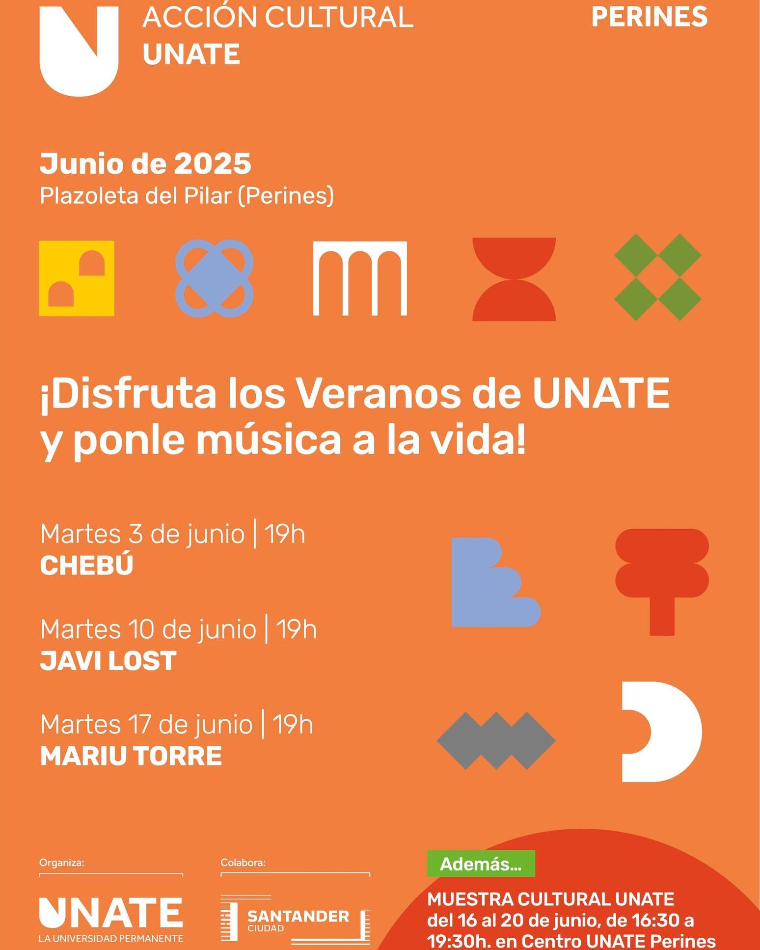 UNATE Santander ha organizado, como cierre de curso 2024-2025, tres conciertos al aire libre que se desarrollarán, si la meteorología lo permite, en la Plazoleta de El Pilar (c/ Perines. Santander).