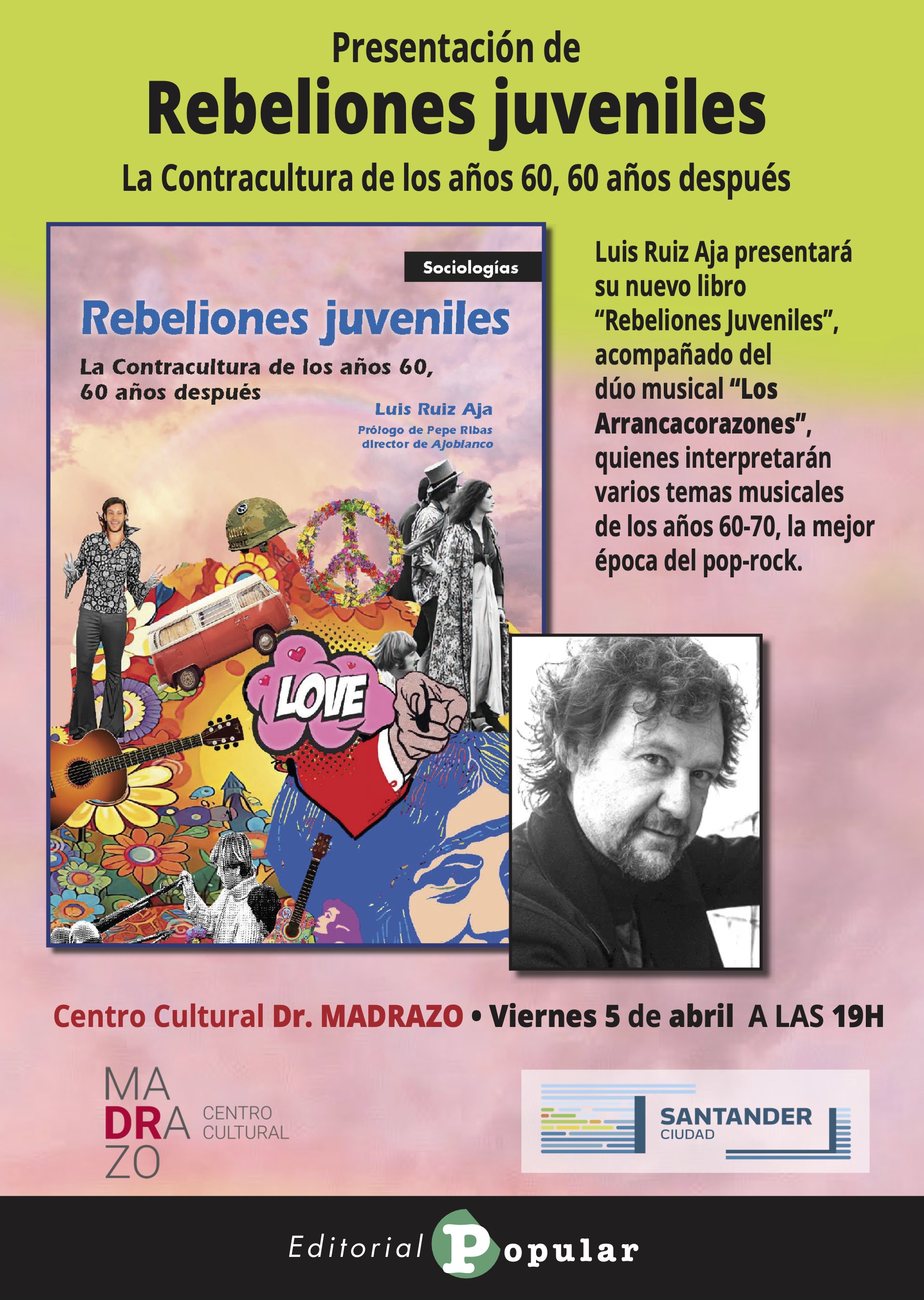 El sociólogo Luis Ruiz Aja hará la primera presentación de su nuevo libro “Rebeliones juveniles” (Ed. Popular) en el Centro Cultural Dr. Madrazo, el viernes 5 de abril a las 19h, en Santander, acompañado del dúo musical “Los Arrancacorazones”, quienes interpretarán varios temas musicales de los años 60-70.