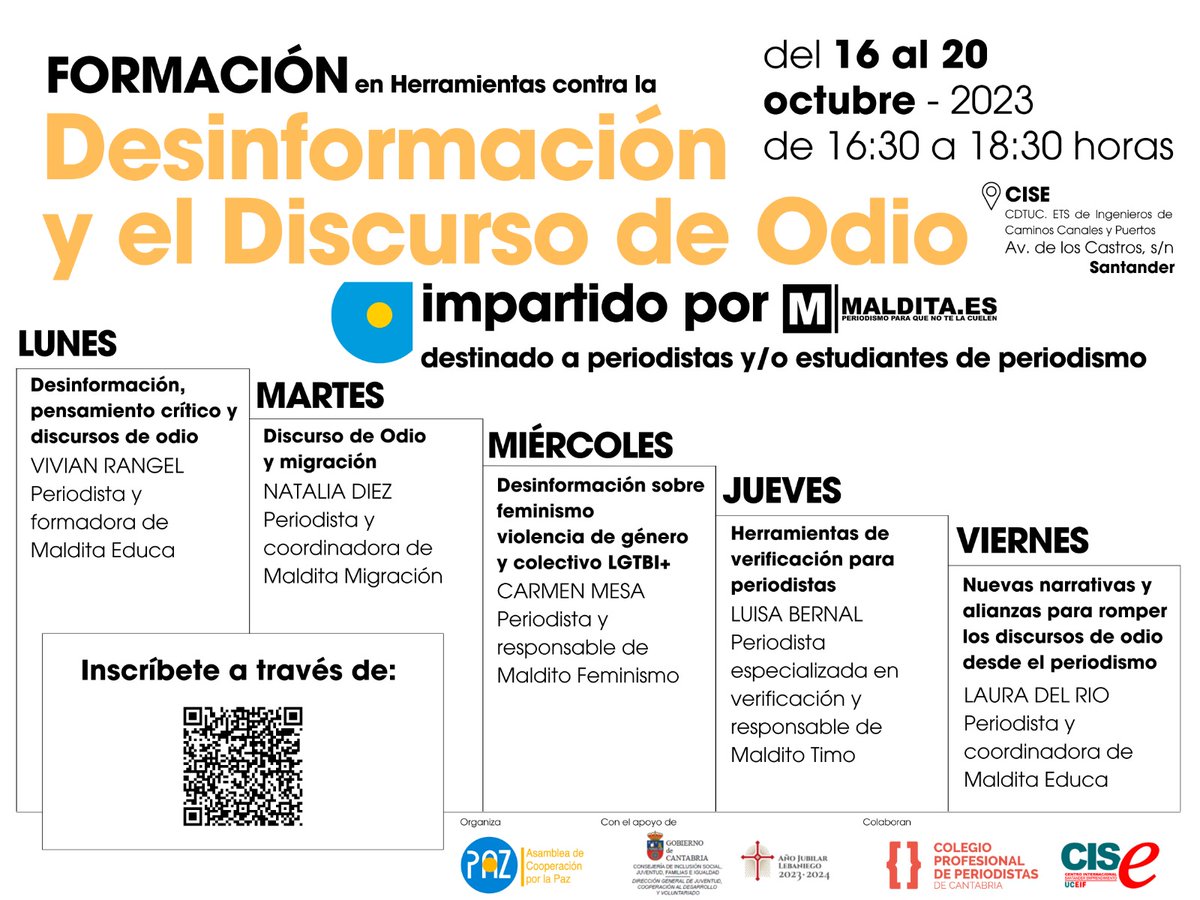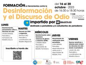 Así, impartirán sesiones miembros de las distintas áreas especializadas de Maldita como Vivian Rangel (Maldita Educa), el lunes, sobre Desinformación, pensamiento crítico y discursos de odio; el martes Natalia Díez (Maldita Migración), sobre discurso de odio y migración; el miércoles Carmen Mesa (Maldito Feminismo), sobre desinformación en torno al feminismo, violencia de género y colectivo LGTBI+; el jueves Luisa Bernal (Maldito Timo), sobre herramientas de verificación para periodistas; y el viernes Laura del Río (Maldita Educa) , sobre nuevas narrativas y alianzas para romper los discursos de odio desde el periodismo.