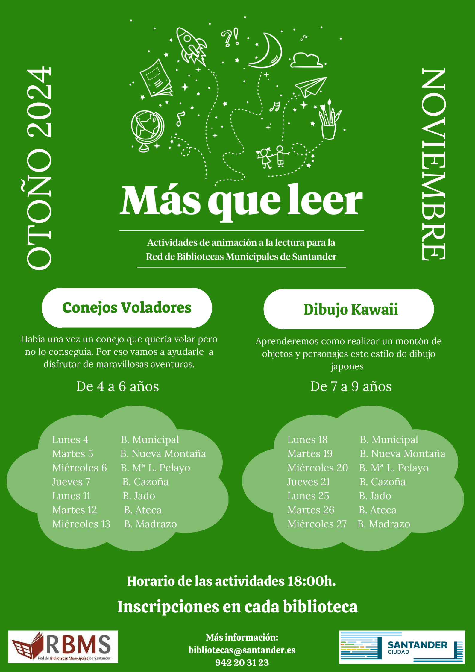 "Más que Leer" es el proyecto de actividades para la animación a la lectura que se desarrolla en la Red de Bibliotecas Municipales de Santander. Se trata de actividades gratuitas para niños, que se realizan en las siete bibliotecas de la red municipal. En esta edición se llevarán a cabo en los meses de octubre, noviembre y diciembre.