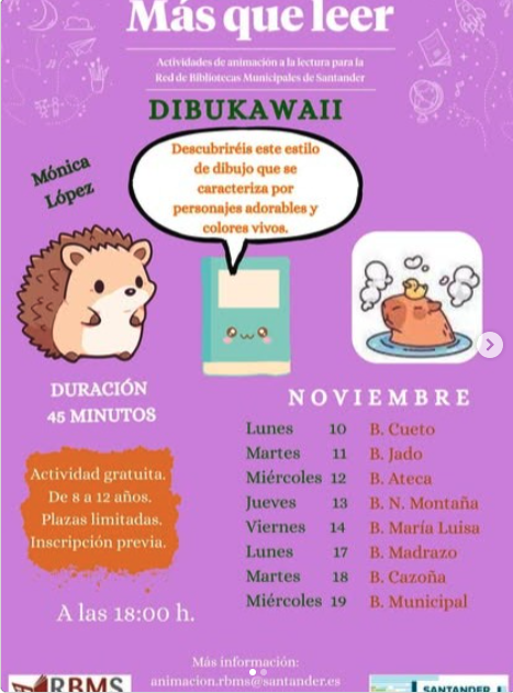 "Más que Leer" es el proyecto de actividades para la animación a la lectura que se desarrolla en la Red de Bibliotecas Municipales de Santander. Se trata de actividades gratuitas para niños, que se realizan en las siete bibliotecas de la red municipal. En esta edición se llevarán a cabo en los meses de octubre, noviembre y diciembre.
