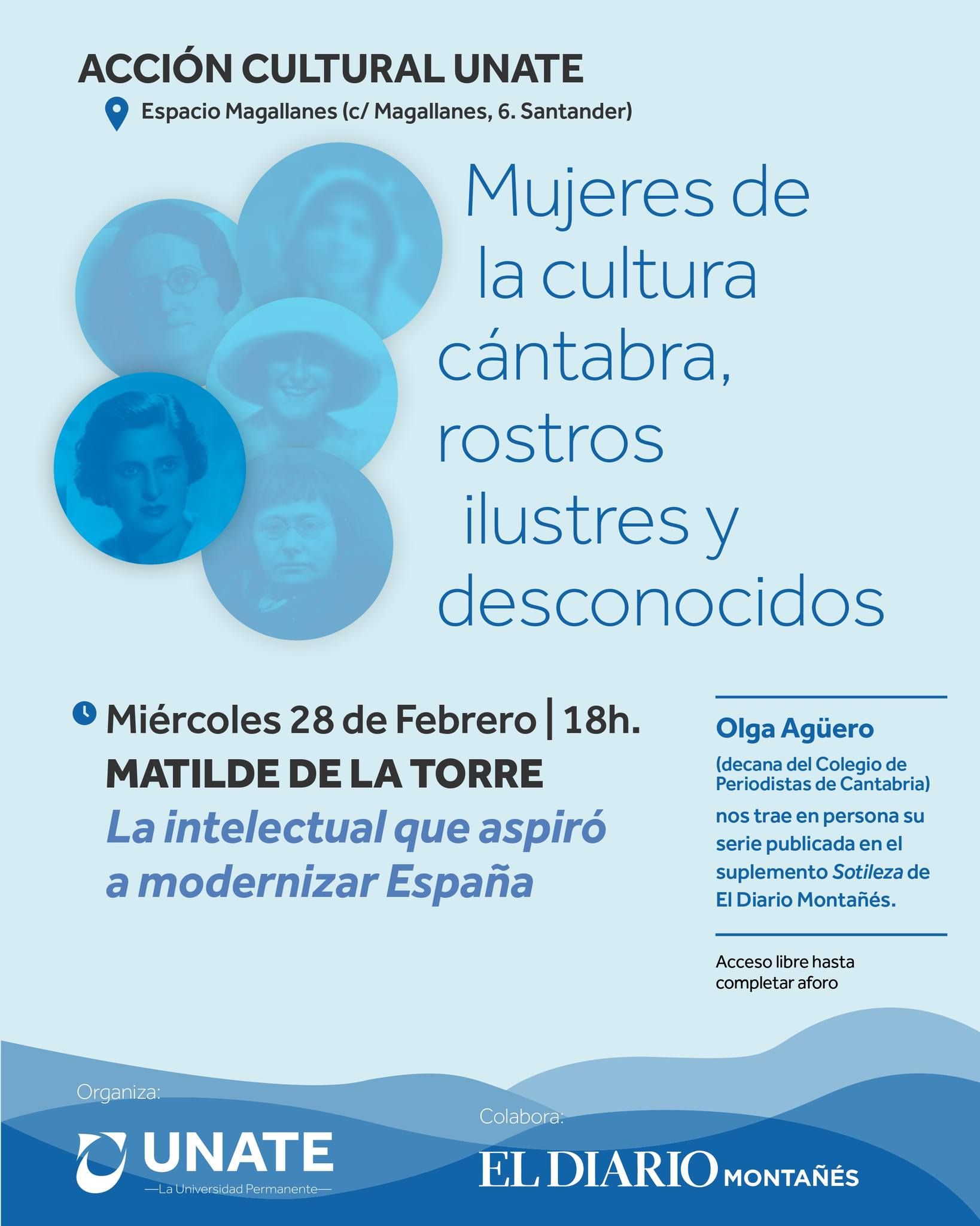 Olga Agüero interviene en Espacio Magallanes con una serie de conferencias sobres mujeres, en muchos casos, invisibilizadas, que destacaron en diferentes ámbitos de la cultura de Cantabria. Este proyecto nace del ciclo de artículos “Cultura cántabra en femenino” publicados en el suplemento cultural Sotileza del Diario Montañés.