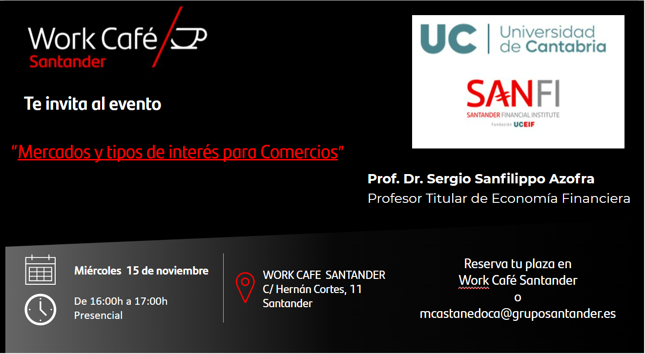 El Work Café Santander de la calle Hernán Cortés organiza este encuentro con Sergio Sanfilippo Azofra, profesor titular de Economía Financiera, en el que se abordarán los “Mercados y tipos de interés para comercios”.