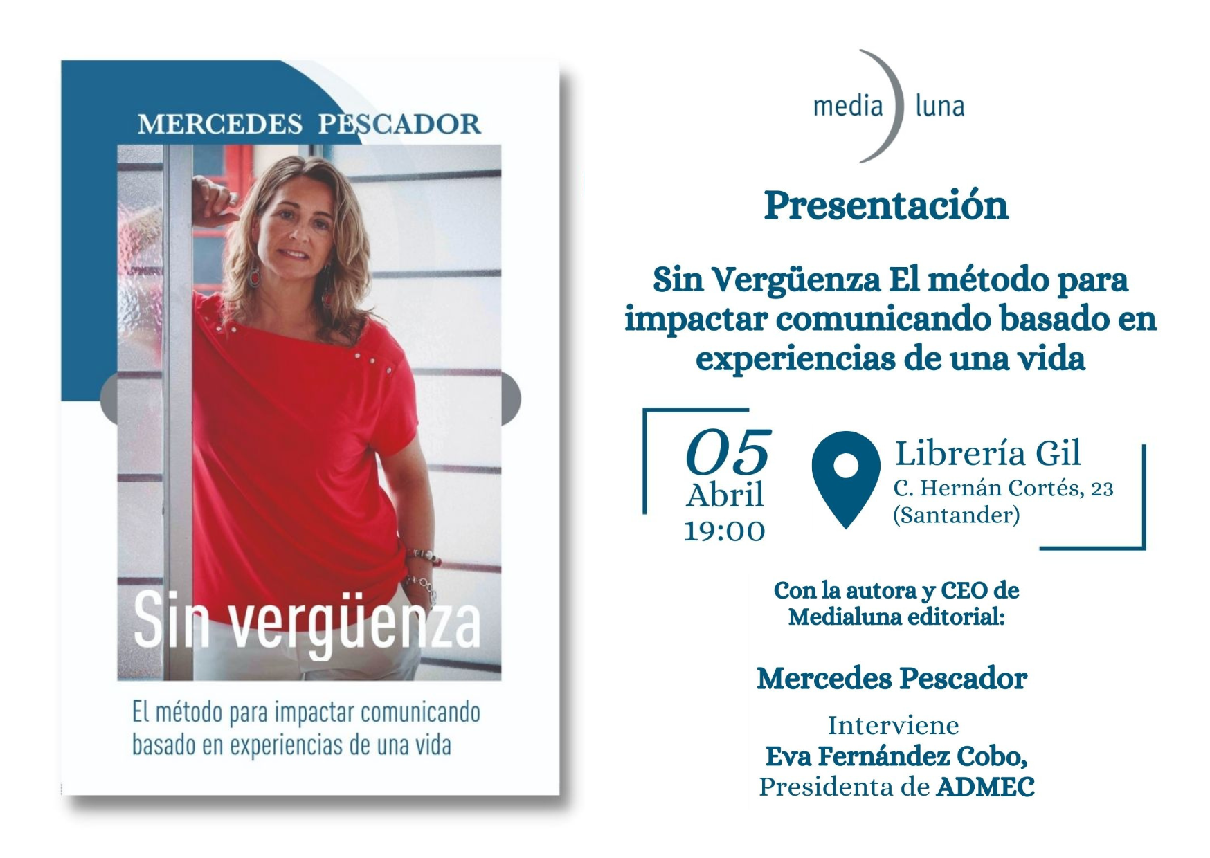El miércoles 5 de abril, a las 19:00 h. la Librería Gil acoge la presentación de “Sin vergüenza (El método para impactar comunicando basado en experiencias de una vida)”, de Mercedes Pescador (Medialuna Editorial). Acompaña a la autora Eva Fernández Cobo, presidenta de ADMEC.