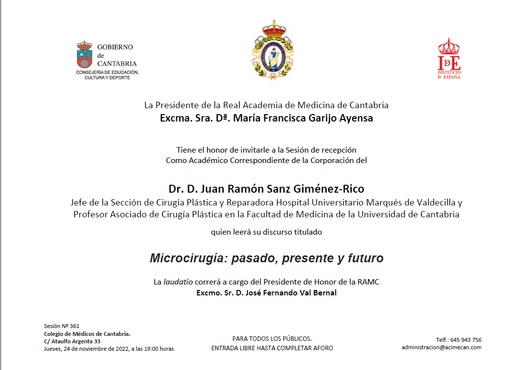 La Real Academia de Medicina de Cantabria celebra sesión académica ordinaria en la que el doctor Juan Ramón Sanz Giménez-Rico impartirá la conferencia “Microcirugía: pasado, presente y futuro”.
