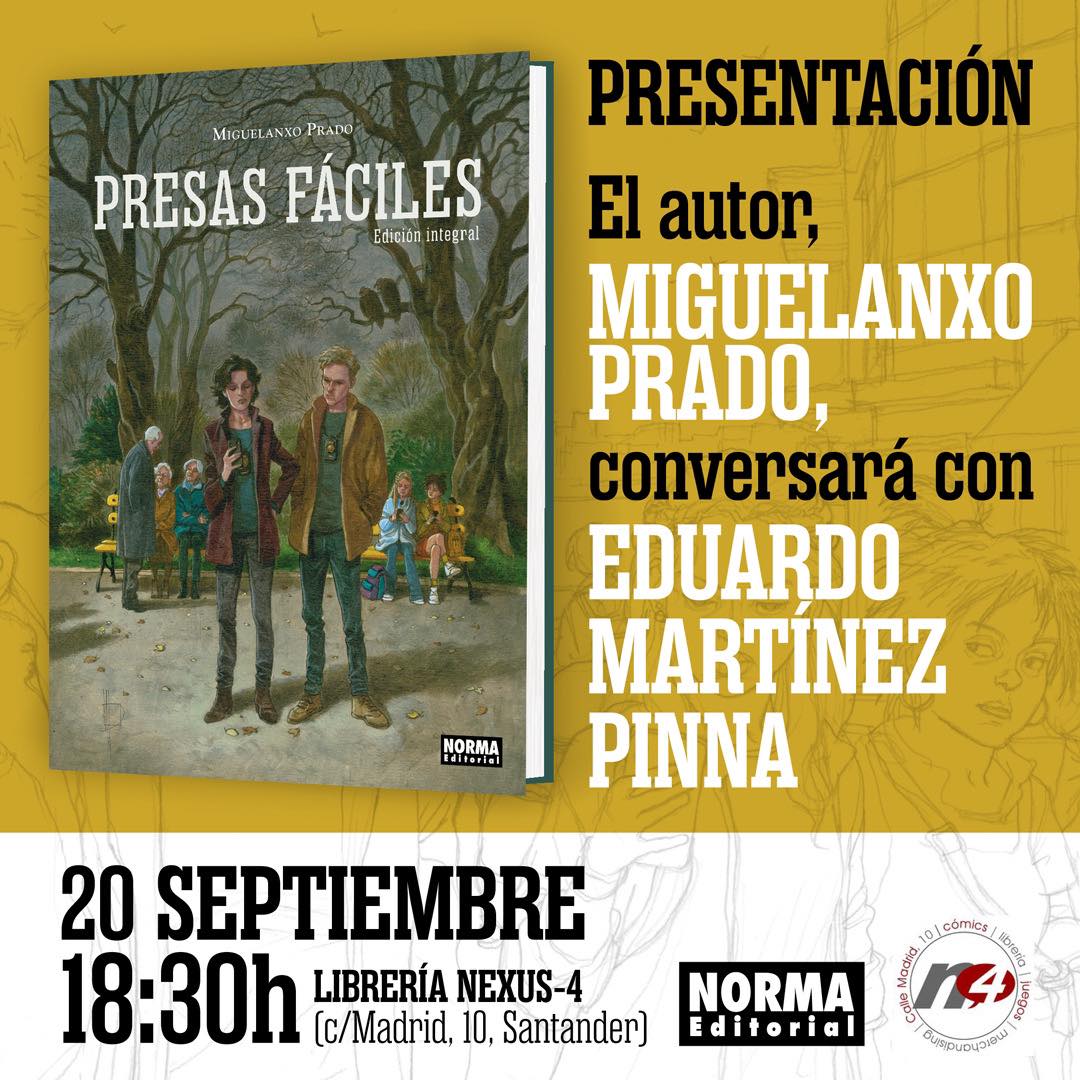 La librería especializada Nexus 4 acoge el viernes 20 de septiembre la presentación del álbum integral “Presas fáciles”, por parte de su autor, el Premio Nacional de Cómic Miguelanxo Prado. Charlará con el autor el teórico sobre cómic Eduardo Martínez Pinna.