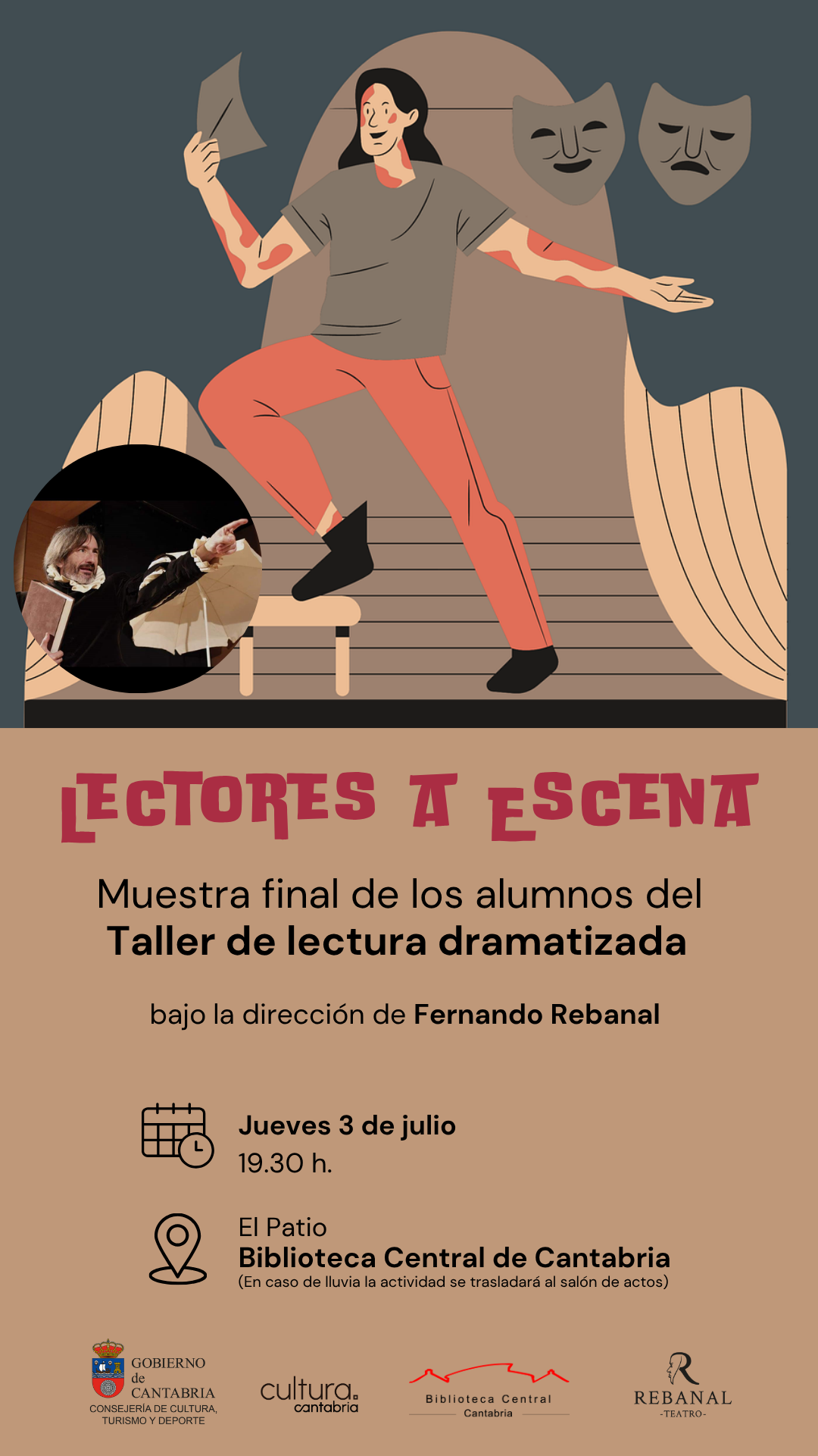 Muestra final de los alumnos del taller de lectura dramatizada "Lectores a escena" el jueves 3 julio a las 19.30 h. en El Patio de la Biblioteca Central de Cantabria. (En caso de mal tiempo la actividad se trasladará al salón de actos)