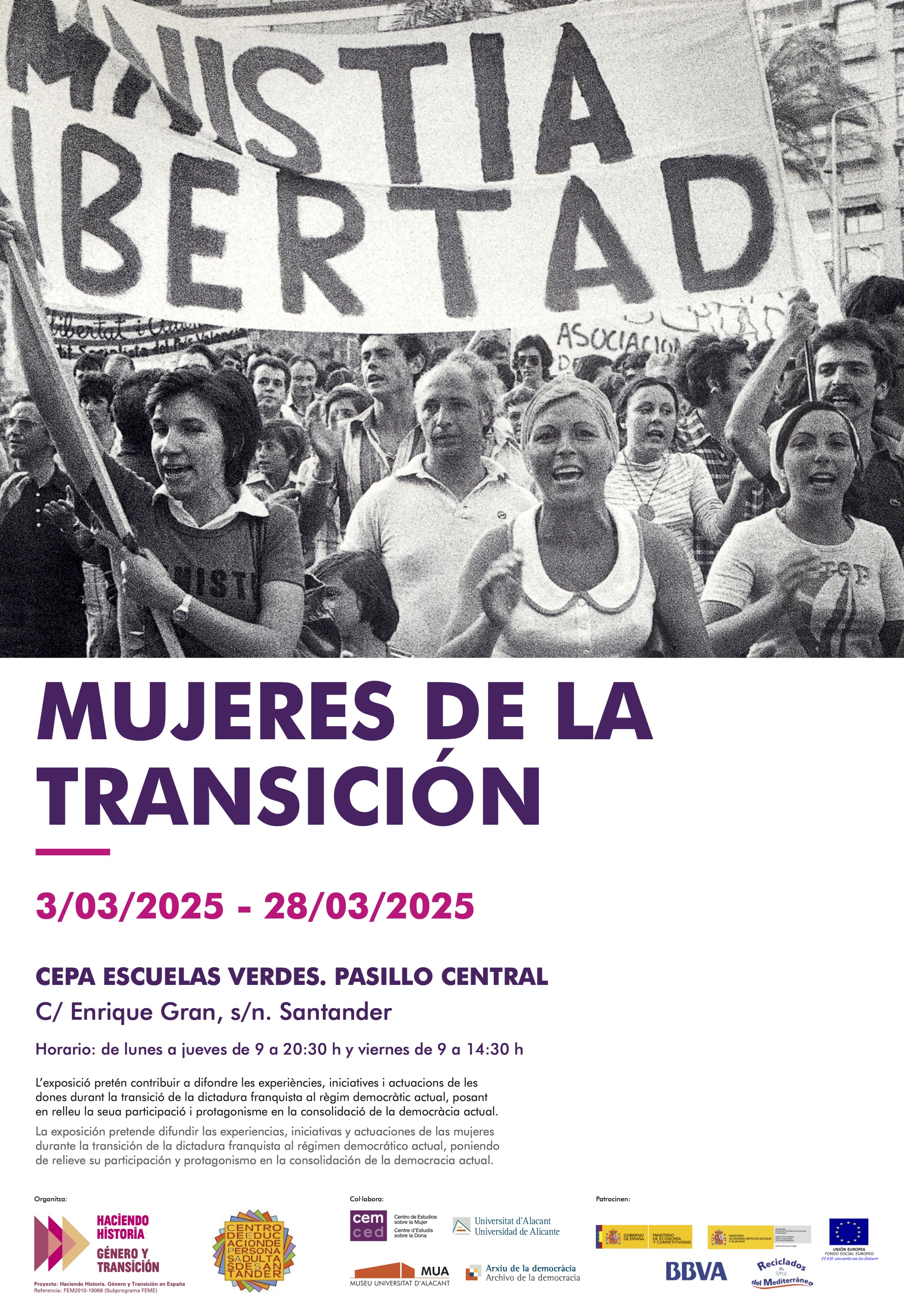 Con motivo de la celebración del día de la mujer el CEPA “Escuelas Verdes” de Santander recoge en su pasillo central la exposición “Mujeres de la Transición”, fruto del proyecto de investigación de la Universidad de Alicante “Haciendo Historia: Género y Transición en España”.