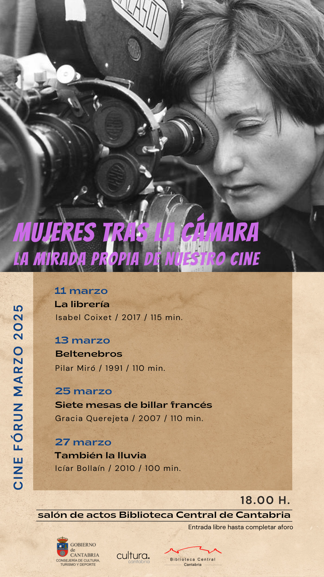 La Biblioteca Central de Cantabria centra las proyecciones del mes de marzo en directoras del cine español. Con motivo de la celebración del Día Internacional de la Mujer (8M), se proyectarán cuatro películas de algunas de nuestras más destacadas realizadoras: Pilar Miró, Icíar Bollaín, Gracia Querejeta e Isabel Coixet.